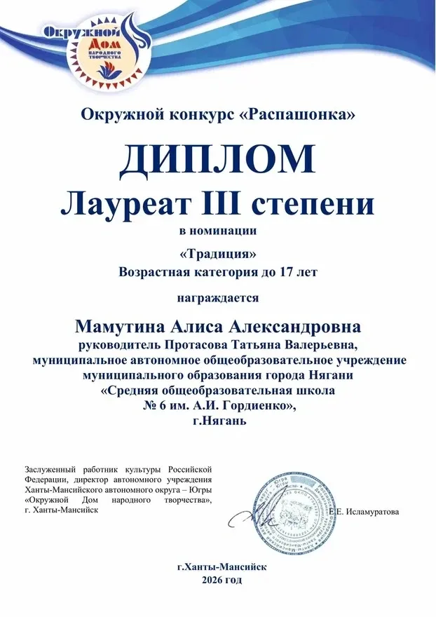 ✨ Поздравляем Мамутину Алису из 5Б класса с прекрасным результатом! ✨ Алиса приняла участие в окружном конкурсе «Распашонка», который был посвящён Году молодой семьи в Югре и Году единства народов России. 🇷🇺💙 С душой и творческим подходом Алиса создала распашонку для новорождённого, украсив её росписью с традиционными народными орнаментами. Её работа заняла почётное 3 место! 🏅👏 От всей души поздравляем Алису с этим достижением и желаем ей новых творческих открытий, вдохновения и ярких побед! Пусть её талант и дальше радует всех вокруг! 🌟🎨
