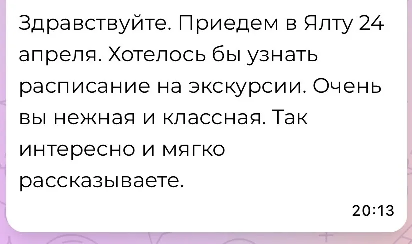 Канал @id910508542861_biz ведет историк-экскурсовод Екатерина Солнце. Это место, где собираются анонсы групповых мероприятий: экскурсий, лекций и лекскурсий по Ялте и Крыму. Также здесь публикуются события, путешествия и полезные заметки о регионе.