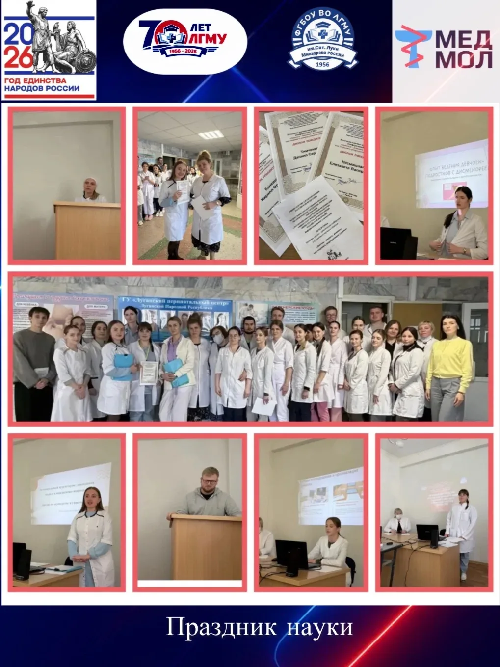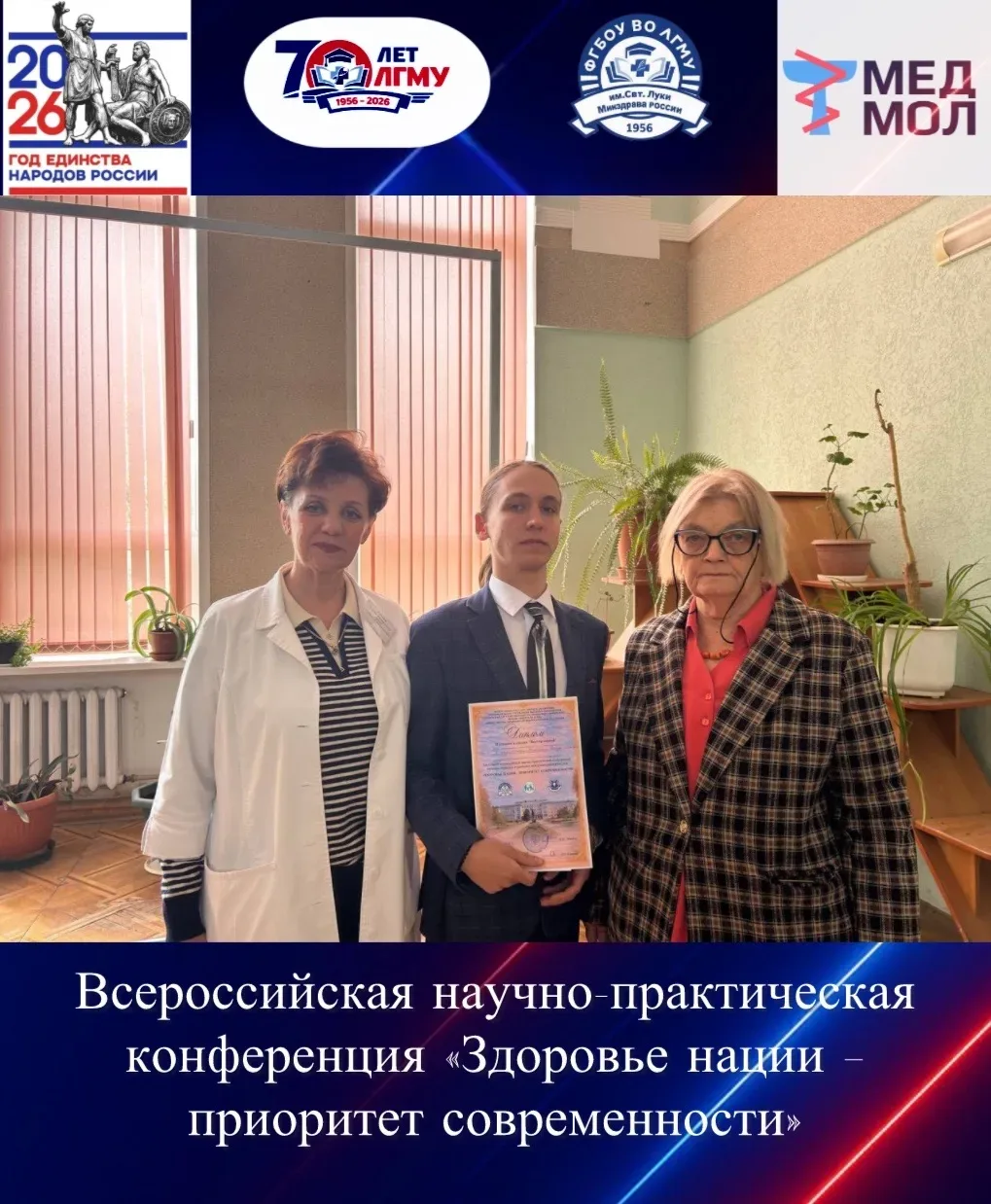 #ГодЕдинстваНародовРоссии Всероссийская научно-практическая конференция «Здоровье нации – приоритет современности» 🔹17.04.26 в стенах нашего университета состоялось масштабное научное мероприятие, посвященное 70-летию ЛГМУ им. Свт. Луки. 🔹Достойно представили кафедру факультетской терапии два докладчика – ассистент кафедры Золотенина Ю.С.: «Диагностика и лечение кардиометаболических расстройств у больных безболевой ишемией миокарда, сочетанной с сахарным диабетом 2-го типа, в постковидном периоде» (научный руководитель – д.м.н., проф. Коломиец В. И.); студент 4 курса 2-б группы Бардаченко Ник…