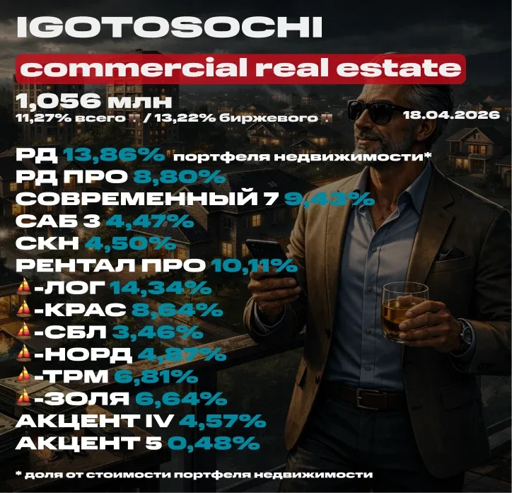 💼 Мой портфель недвижимости на 18 апреля 2026 (ЗПИФ). Состав, последние покупки, планы и новости Что по железобетону? Второй миллион в недвижке набирается медленно! А ведь я повысил целевую долю недвигофондов вдвое, а значит нужно регулярно смотреть, как идут успехи и что внутри какие веса занимает. Размер ЗПИФ-портфеля 1,056 млн, и в нём есть новые покупки. Несмотря на них, стоимость стала даже ниже. Напоминаю, что я собрал основные биржевые ЗПИФы недвижки в крутую сводную таблицу. На днях обновил последние выплаты. Пользуйтесь. ⏳ Предыдущий срез был 30 марта. Новые покупки — относительно эт…