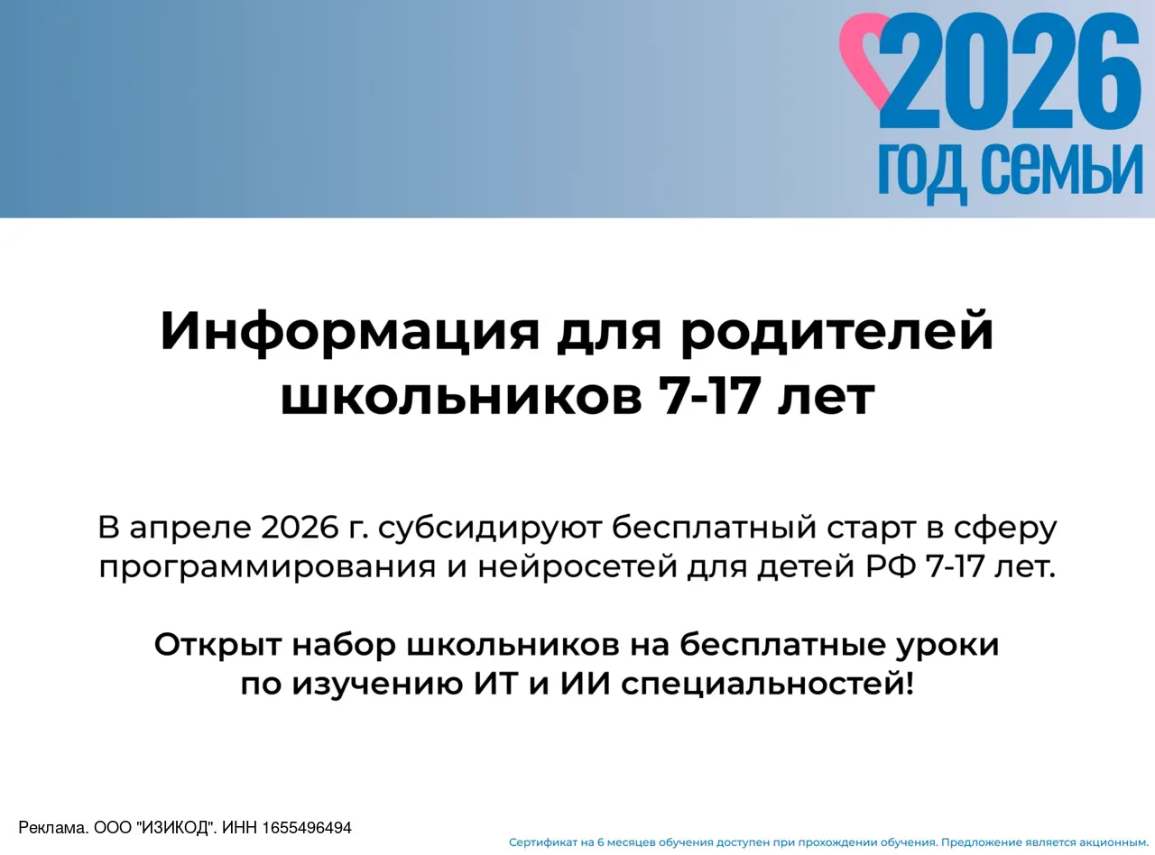 Для детей 7-17 лет РФ запустили бесплатное 6-месячное обучение ИТ-профессиям. Родители, это отличная возможность для вашего ребёнка погрузиться в новую и высокооплачиваемую сферу. Приём заявок продлится с 1 по 20 апреля, а количество льготных мест ограничено. Чтобы понять, доступно ли вам бесплатное полугодовое обучение, нужно заполнить анкету и пройти тестирование (займёт всего ничего – меньше трёх минут). Вы сразу узнаете, попадает ли ваш ребёнок на программу и какая профессия ему подходит. Пользуйтесь.