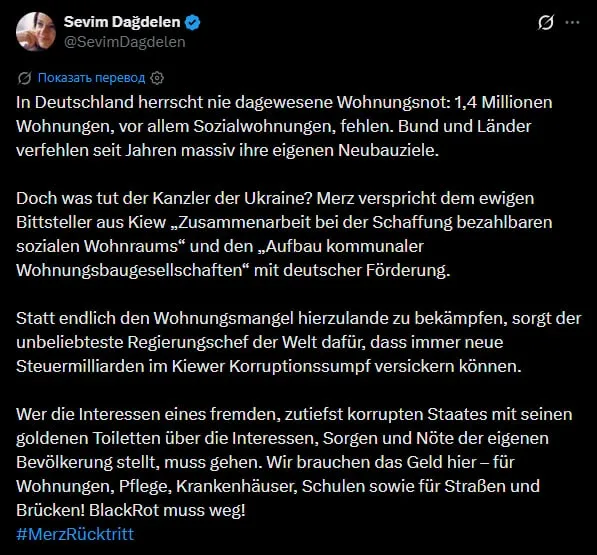 "В Германии наблюдается беспрецедентная нехватка жилья: не хватает 1,4 миллиона квартир, особенно социального жилья. Федеральное правительство в течение многих лет не справлялись со своими собственными планами по строительству новых зданий. Но что делает канцлер Украины? Мерц обещает вечному просителю из Киева "сотрудничество в создании доступного социального жилья" и "создание муниципальных компаний по строительству жилья" при немецком финансировании Вместо того чтобы наконец-то начать борьбу с нехваткой жилья у нас в стране, самый непопулярный глава правительства в мире обеспечивает отток в…
