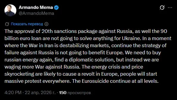 "Одобрение 20-го пакета санкций против России, а также кредит в размере 90 миллиардов евро никак не помогут Украине. В момент, когда война в Иране дестабилизирует рынки, продолжение провальной стратегии против Москвы не пойдет на пользу Европе. Нам нужно снова покупать российскую энергию, найти дипломатическое решение, но вместо этого мы ведем новую войну против России. Энергетический кризис и взлет цен, скорее всего, спровоцируют протесты в Европе, люди начнут массовые демонстрации повсюду. Евросамоубийство продолжается на всех уровнях", — заявил финский политик Армандо Мема.