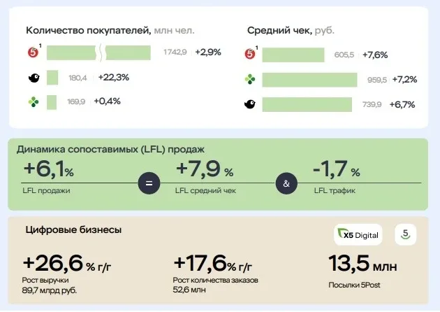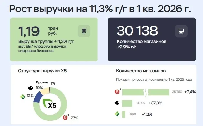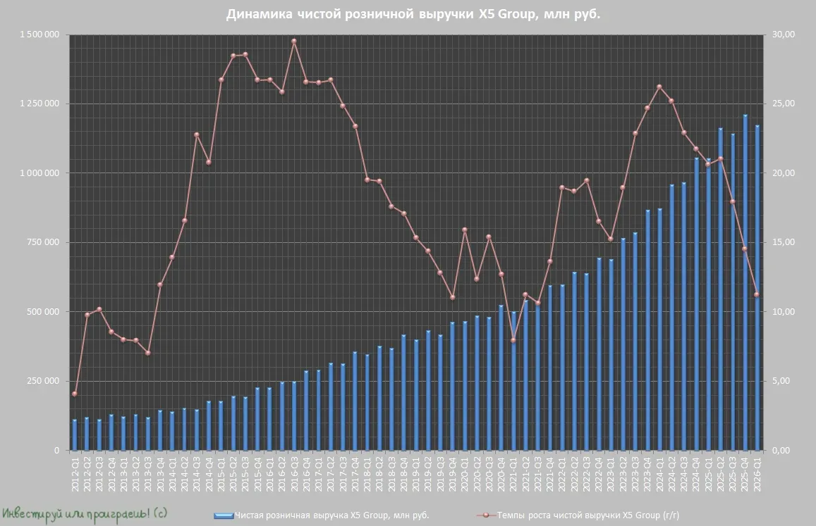 Дивергенция, которая может принести прибыль: разбираем отчёт X5 🛒 Лидер отечественного продуктового ритейла X5 представил в четверг свои операционные результаты за 1 кв. 2026 года, опираясь на которые давайте попробуем оценить инвестиционные перспективы эмитента и порассуждаем, достойны ли акции компании попадания в наши портфели на текущей коррекции. 📈 Итак, выручка X5 с января по март увеличилась на +11,3% (г/г) до 1,2 трлн руб., благодаря сочетанию расширения торговых площадей и росту среднего чека. Оценки Росстата и крупнейших российских банков дружно указывают на замедление потребительск…