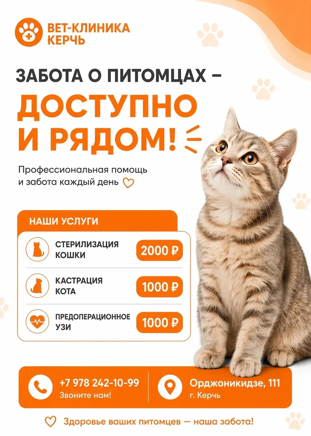 Керчь, ул. Орджоникидзе, 111А — Наша ветеринарная клиника ждёт вас! 🔥 Профессиональное оборудование, опытные врачи, мы всегда рядом!🏥 🐱 Кастрация кота — 1000 ₽ 🐾 Стерилизация кошки — 2000 ₽ Почему это важно: ✅ Дольше и спокойнее жизнь без гормональных сбоев и стресса ✅ Нет меток, криков, риска инфекций, и мочекаменных болезней ❤️ Перед наркозом — УЗИ сердца всего за 1000 ₽ Безопасность превыше всего. Запись по телефону: 📞 +7(978) 242-10-99 Реклама | ИП ПЯТИГОРЕЦ Е. П. ИНН 910914275400 | erid 2VtzqwTiVhR