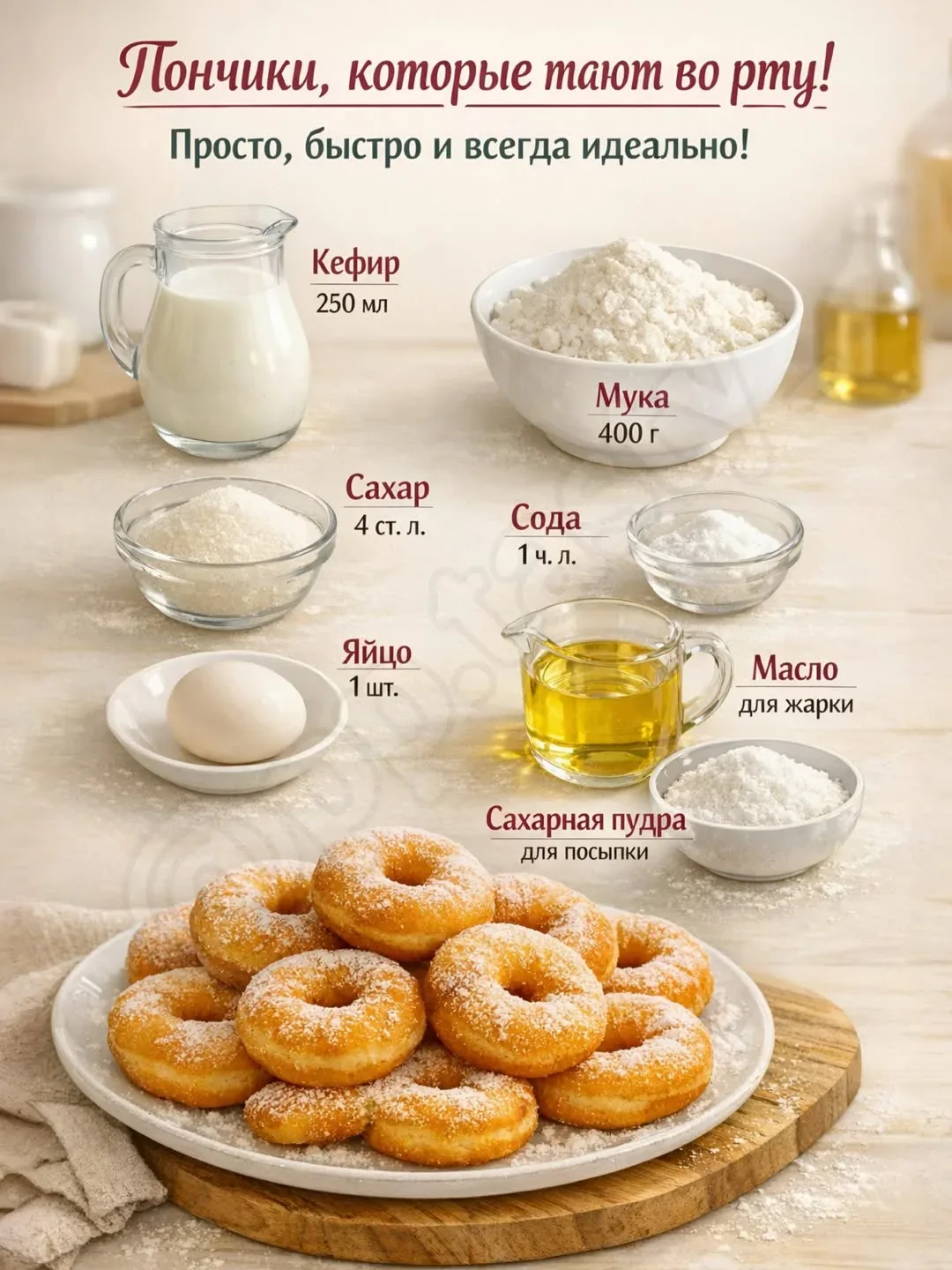 Пончики, которые тают во рту 😍🍩 Это тот самый рецепт, когда хочется чего-то домашнего, мягкого и очень вкусного к чаю ☕️ Снаружи они румяные и золотистые, а внутри нежные-нежные — и готовятся без сложностей и лишней возни 🤤💛 ✅ Ингредиенты: 🥛 Кефир — 250 мл 🥣 Мука — 400 г 🍚 Сахар — 4 ст. л. 🥄 Сода — 1 ч. л. 🥚 Яйцо — 1 шт. 🫒 Масло — для жарки 🍥 Сахарная пудра — для посыпки ✅ Как готовлю: Смешиваю кефир, яйцо и сахар до однородности 🥛🥚 Добавляю соду и постепенно всыпаю муку, замешиваю мягкое тесто 🥣 Раскатываю тесто и вырезаю пончики 🍩 Разогреваю масло и обжариваю пончики с двух сторон до красив…