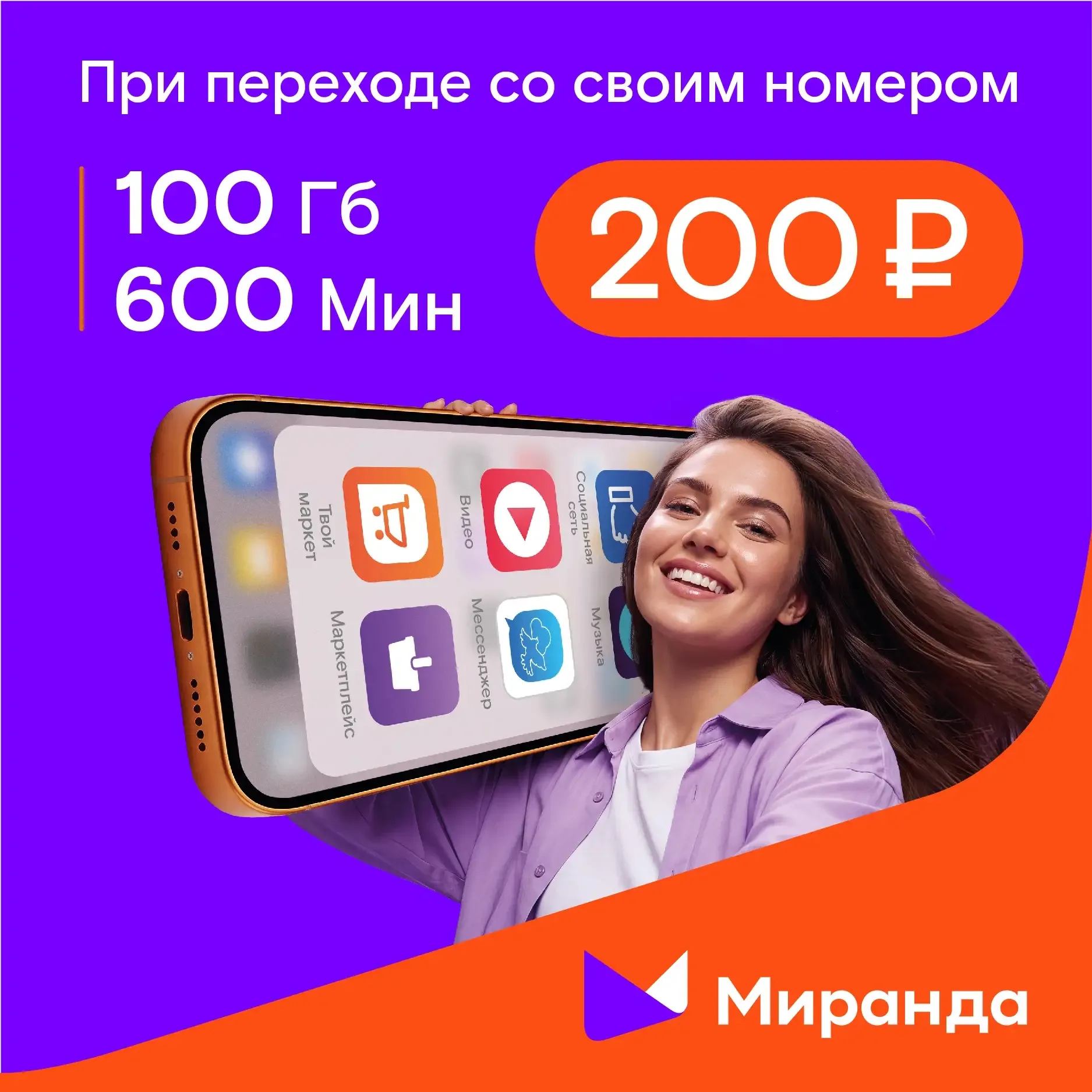 Переходи по-нашему 💜 Переходи в сеть «Миранды» со своим номером, одновременно подключай тариф «Супер М» и плати 200 рублей абонентской платы в месяц за 100 гигабайт и 600 минут. Плюс безлимитные сервисы и перенос остатков на следующий месяц 🤫 Акция действует с 15 апреля по 6 июля. Более подробную информацию про условия акции можно прочитать на сайте.
