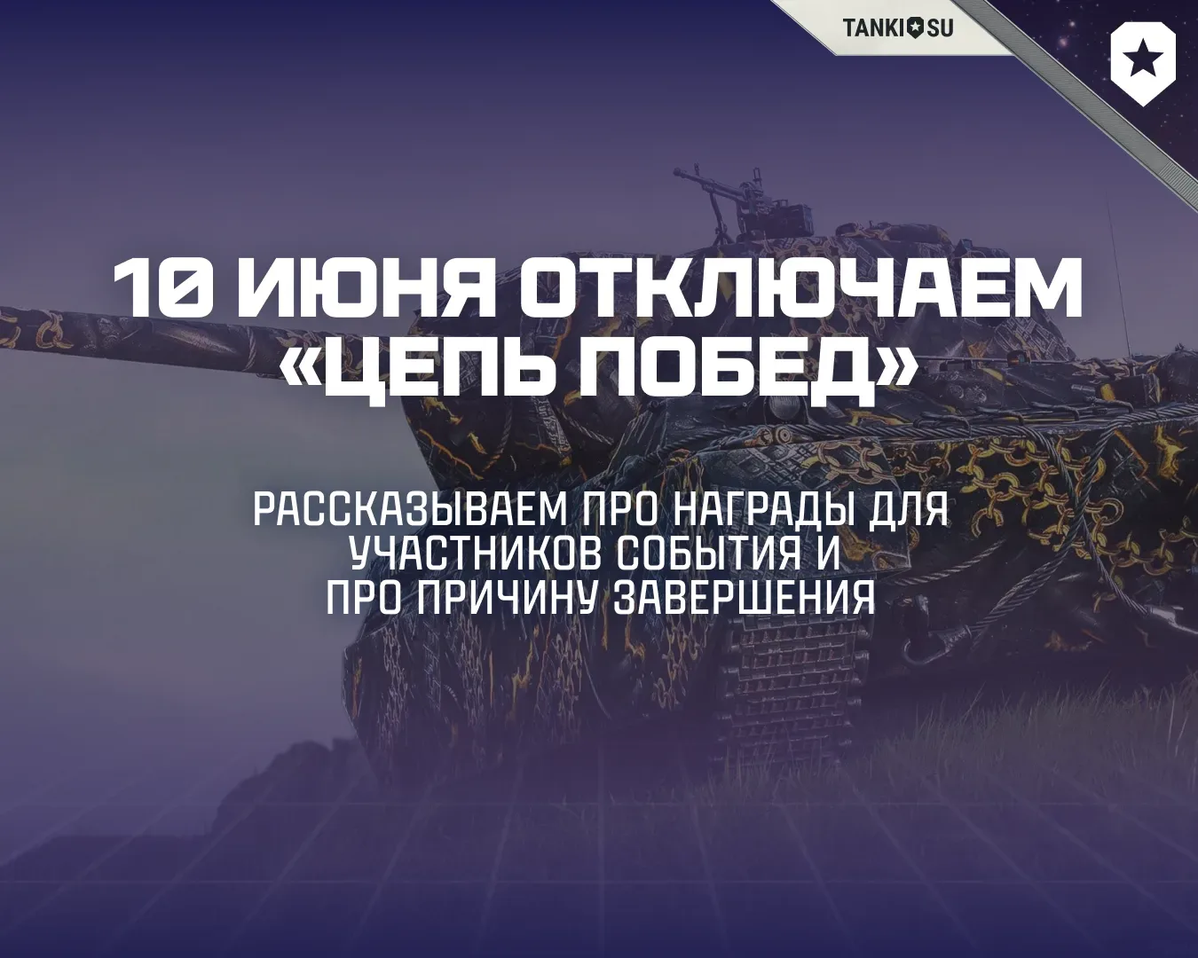 🤝 Мы заметили, что активность в «Цепи побед» снижается, поэтому приняли решение его завершить. Награды этого события мы перераспределим в другие игровые активности! ㅤ 👇 Что будет дальше? ✅ Наиболее желанные награды «Цепи побед» останутся с вами. Машины, которые выдавались в рамках события в аренду, можно будет забрать навсегда. ✅ Игроки с серией выполненных задач более 30 дней получат в подарок танк TOG II*, а с серией свыше 180 дней — ещё и Т-44-100. Кроме того, обе машины будут временно доступны к покупке в Премиум и внутриигровом магазине. ✅ Самым стойким танкистам с серией более 300 дней …