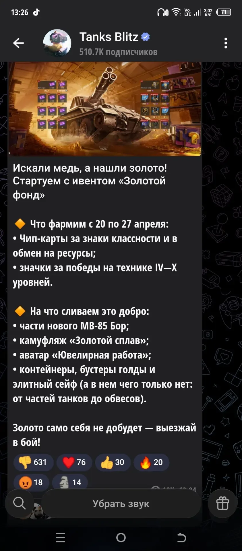 Канал ведётся с 06.03.2026 и объединяет игроков. Здесь можно найти материалы, связанные с геймплеем, и погрузиться в атмосферу игры. Для обратной связи и предложений от подписчиков создан специальный чат — предложка. Основные хештеги канала: #Tanks_Blitz и #LESTA, что сразу обозначает его игровую специализацию.