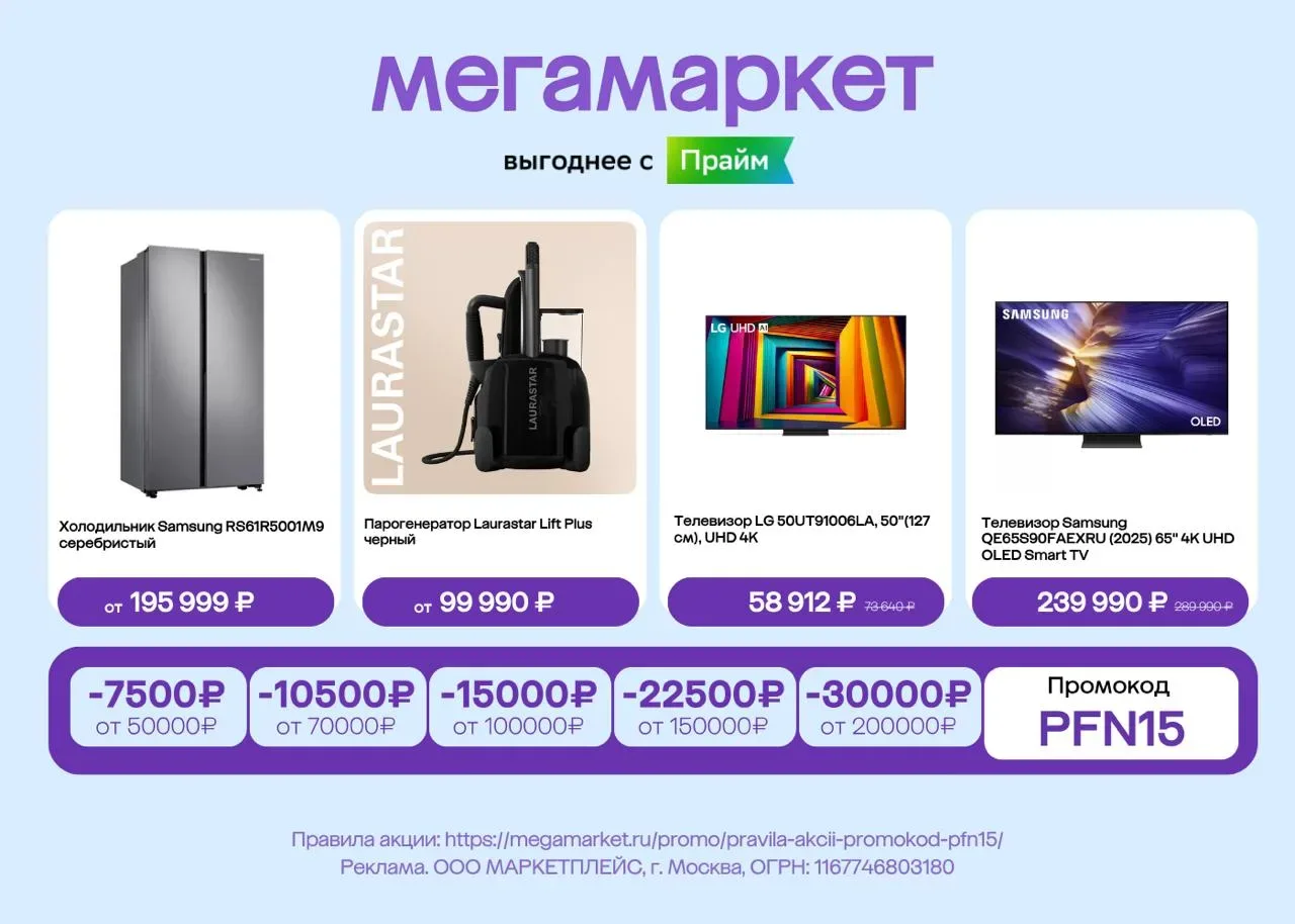 🔥🔥🔥 Всё актуальные промокоды Мегамаркета на МАРТ 2026: года на Первый и ПОВТОРНЫЙ заказ! (Обновлено 20 апреля 2026) ☝️ Друзья, мы по работе ПЕРВЫМИ получаем НОВЫЕ промокоды Мегамаркета 📱 и публикуем их СРАЗУ, как они выходят! Подпишитесь на наш канал 👈🏻 1. Промокоды Мегамаркета 📱 на ЛЮБОЙ заказ для ВСЕХ 📱 Для ВСЕХ! ❗️Скидка от 7 500₽ до 30 000₽! Успеваем❗️ ➡️ PFN15 - повышенная скидка 7 500₽ (!) от 50 000₽, 10 500₽ от 70 000₽, 15 000₽ от 100 000₽, 22 500₽ от 150 000₽, 30 000₽ от 200 000₽ на один ЛЮБОЙ заказ в Мегамаркете по ссылке 👈🏻 (сработает только на товары по ссылке, но их ОЧЕНЬ МНОГО!).…