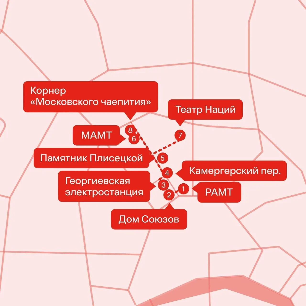 📌 Маршрут по улице с историей На сайте RUSSPASS есть аудиогид по одной из самых театральных и музыкальных улиц Москвы — Большой Дмитровке. В пути откроется вид на дом, где Александр Пушкин проиграл целое состояние, и прозвучит рассказ о рождении знаменитого творческого тандема Станиславского и Немировича‑Данченко. 📍 Основные локации прогулки отметили на карте. Маршрут начинается у Дома Союзов и пройдет через РАМТ, Георгиевскую электростанцию и несколько именитых театров. Одна из точек — пространство «Московского чаепития», где можно попробовать чай «Москва» с традиционной столичной выпечкой.