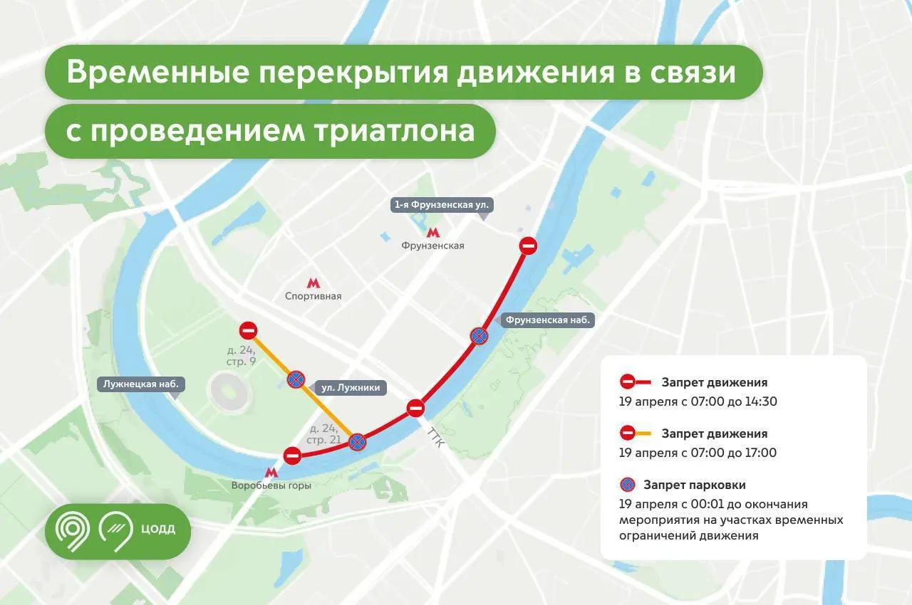 ⛔️ Завтра в Хамовниках перекроют движение из-за соревнований по триатлону. Ограничения будут действовать с 7 утра на Лужнецкой и Фрунзенской набережных.