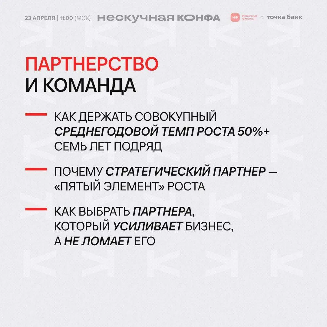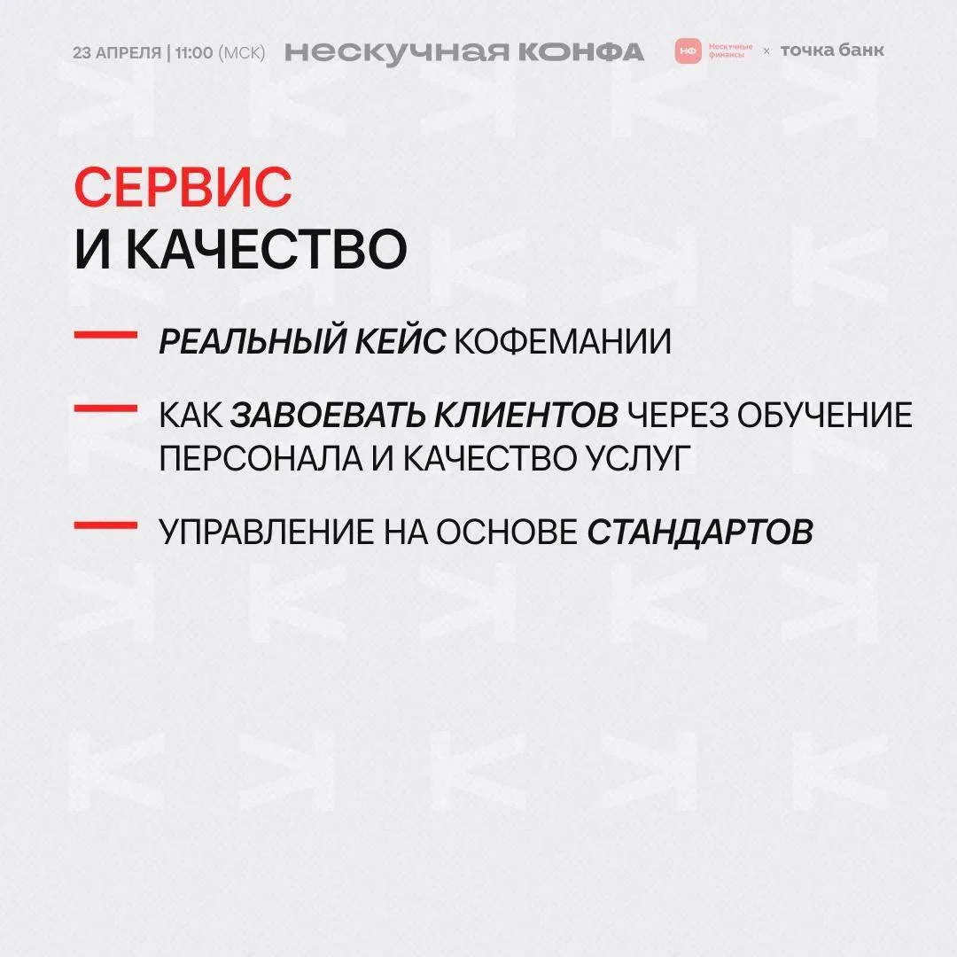 ☄️ Как хакнуть рост бизнеса в 2026 году 23 апреля на Нескучной конфе будем разбирать рычаги, за счет которых бизнес сегодня реально может расти. Вот три из них: 1️⃣ Сервис и качество В 2026 году нельзя расти, если клиенту все равно, вернуться к вам или уйти к другим. Сильный сервис увеличивает срок жизни клиента, повышает лояльность и дает рост без постоянной гонки за новым трафиком. Инесса Ермишкина раскроет, как Кофемания удерживает высокий стандарт сервиса через обучение команды — и как это влияет на лояльность гостей, повторные визиты и экономику клиента. 2️⃣ Инвестиции и партнерство Когд…