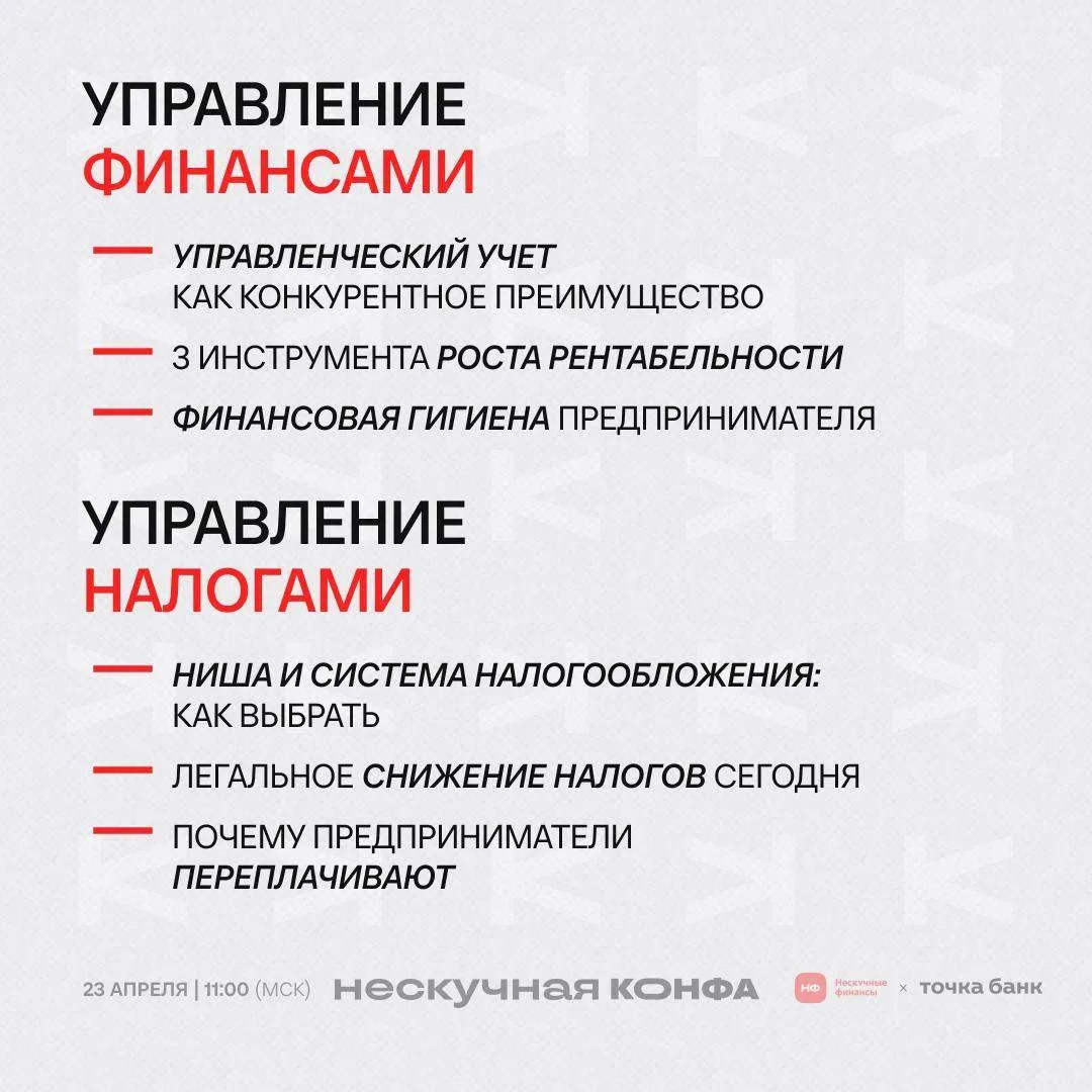 🗓 21 апреля | Казань | 16:00-21:00 | конференция «Бизнес без жертв» от Академии «Стратег» Практики и эксперты расскажут, как выстроить бизнес, который работает без вашего постоянного участия. Финдир НФ Ольга Огнянова выступит на тему «Финансовый интеллект предпринимателя: какие навыки нужны для роста бизнеса» Вопросы: @akademya_strateg 🗓 23 апреля | онлайн | 11:00–12:30 | вебинар в Московском гарантийном фонде на тему «Как эффективно управлять бизнесом с помощью цифр» Финдир НФ Ольга Огнянова поделится: — Как устроен бизнес с точки зрения финансов. — Ключевые области, влияющие на результат. —…