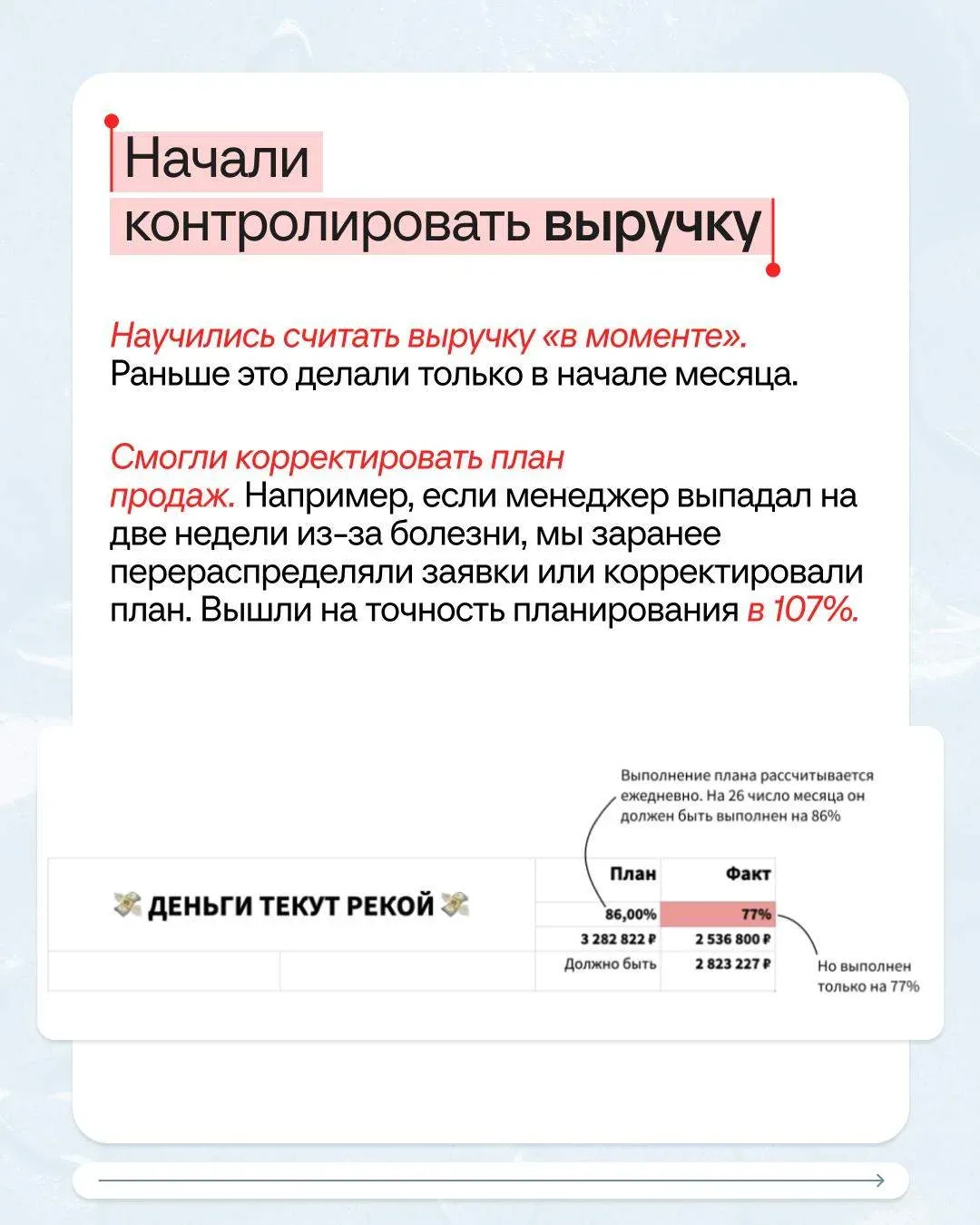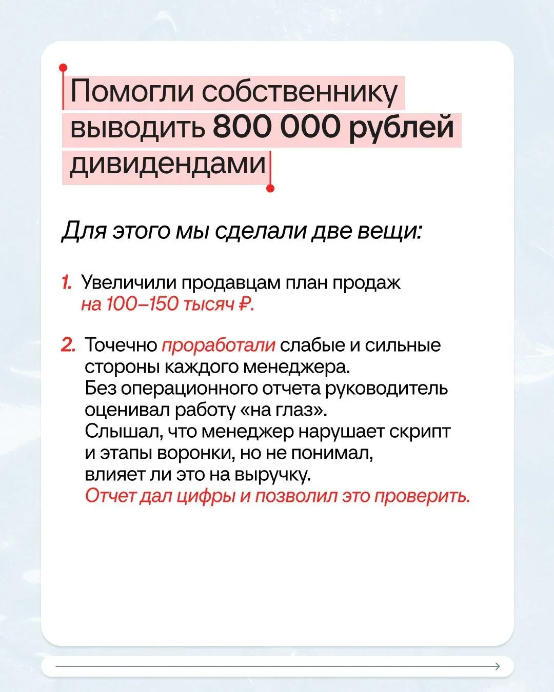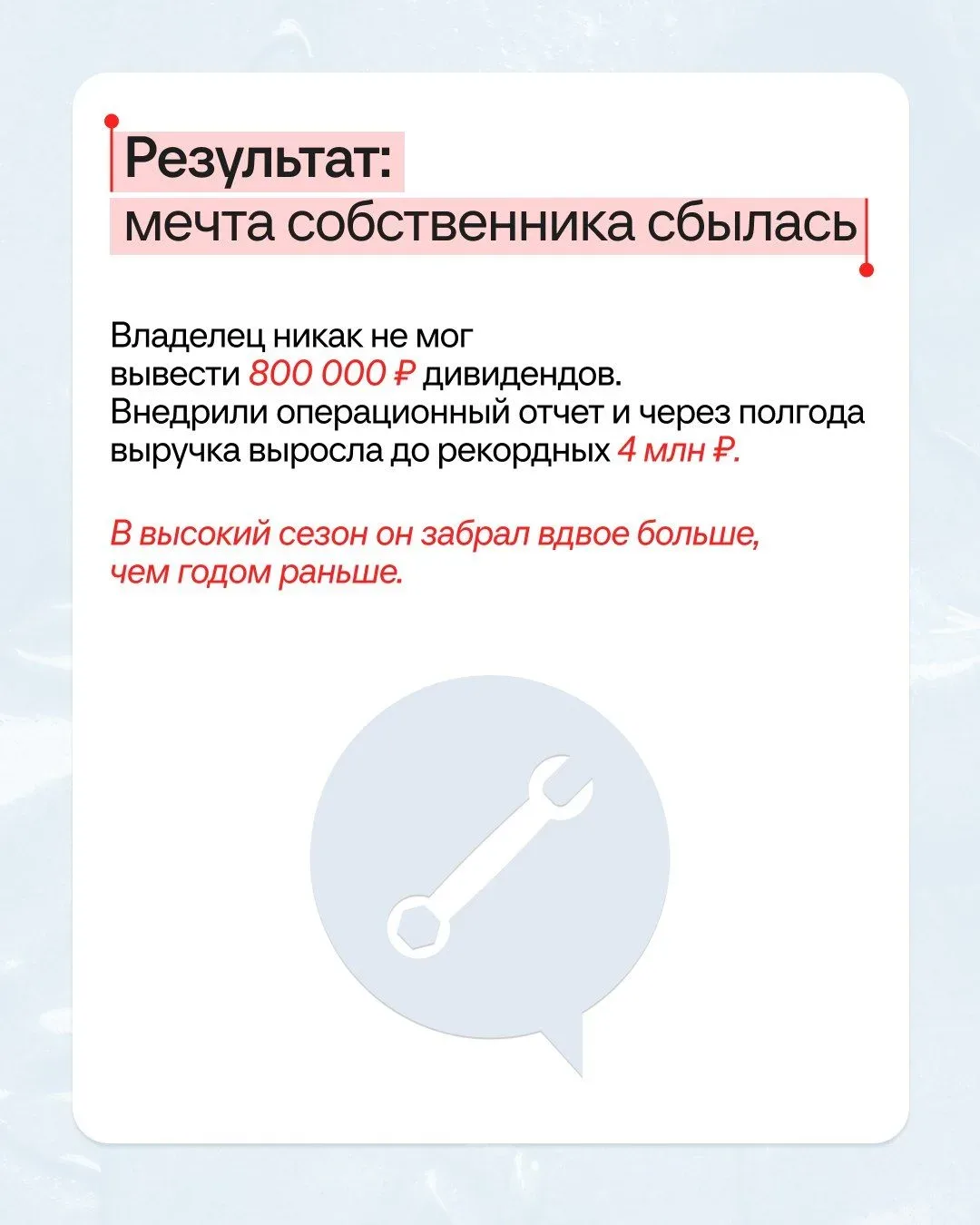 ⭕️КЕЙС⭕️ Собственник хотел 800 000 рублей в месяц, получалось — 300 000 рублей дивидендов. Решили! Клиент — туристическое агентство, больше пяти лет отправляет людей на отдых в разные страны. И все это время собственник недоволен: если повезет, дивиденды будут. Не повезет — придется жить на зарплату и отложить собственный отпуск на море 🐳 Исполнили мечту предпринимателя всего за 4 месяца и с помощью одного отчета. Как — читайте в карточках. Получите персональный план безопасного роста бизнеса бесплатно! Приходите на диагностику 7 сфер управленческого учета