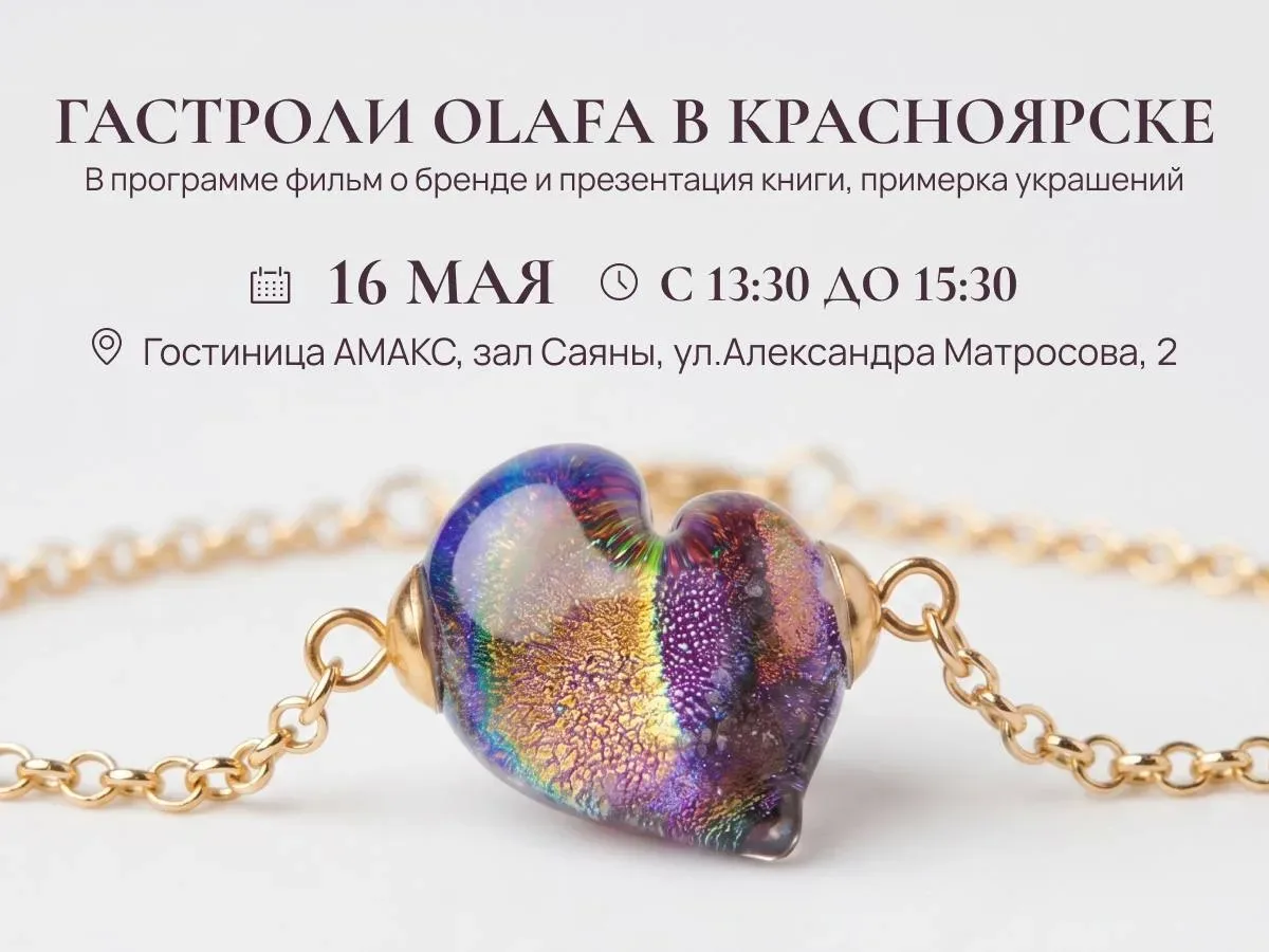 Красноярск, пойдем в театр? 🎭 В рамках гастрольного тура Olafa 16 мая мы летим к нашим соседям в Красноярск. И предлагаем провести вместе почти всю субботу! Дневная программа с 13:30 до 16:00: ✔️презентация новинок, созданных специально для Красноярска; ✔️ примерка украшений; ✔️ короткометражный фильм о бренде Olafa; ✔️ презентация книги «Путь Olafa. 33 честные истории»; ✔️ и возможность познакомиться поближе. 📍 Локация: гостиница АМАКС (ул. Александра Матросова, 2). Стоимость участия — 500 ₽. Эта сумма полностью засчитывается как депозит на покупку украшений. А после этого собираемся и едем …