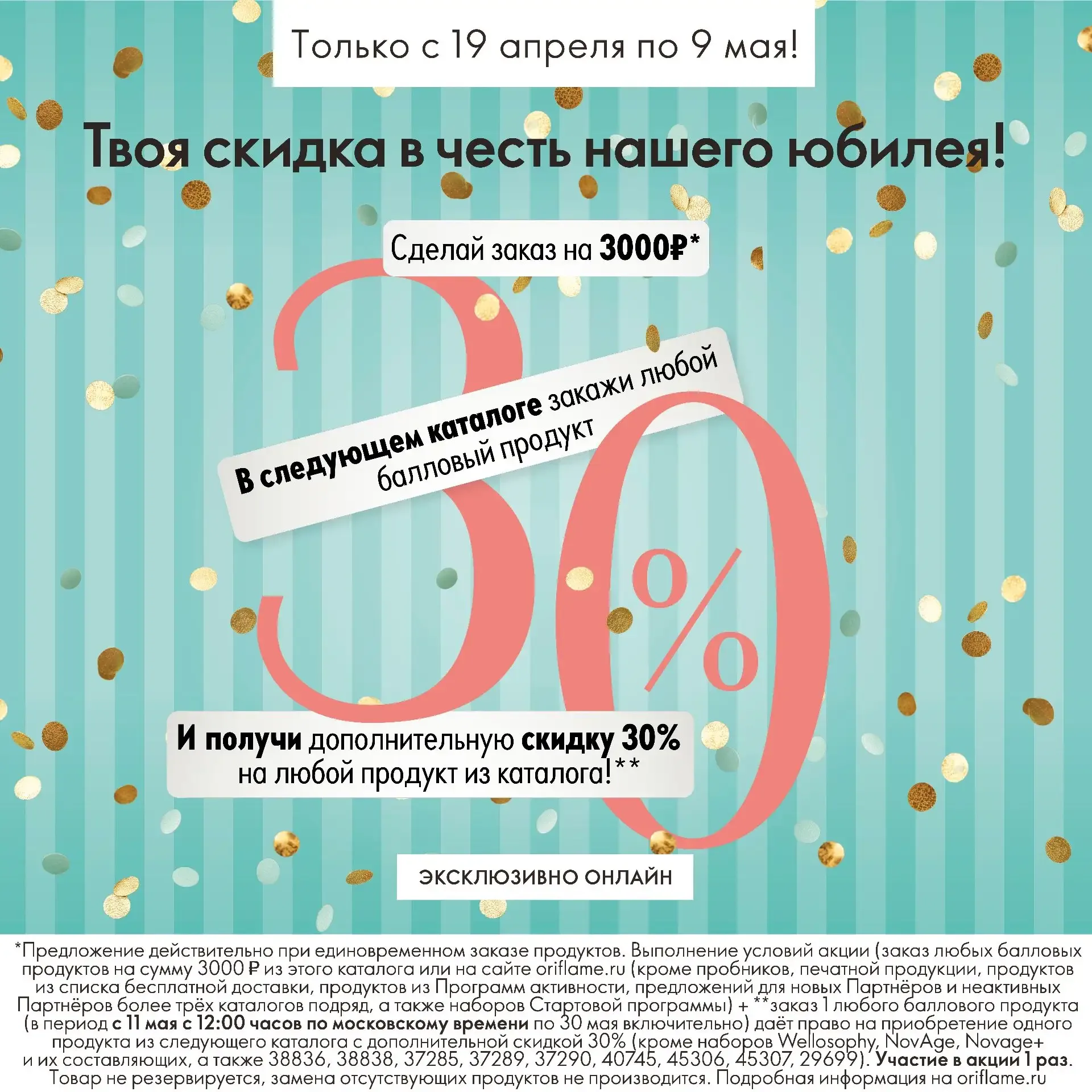 Эксклюзивно онлайн! В честь юбилея компании! ★ С 19 апреля по 9 мая включительно оформите единовременный заказ на сумму не менее 3000 рублей и получите дополнительную скидку 30% на любой продукт из каталога №7. Обратите внимание: • Выполнение условий акции: заказ на 3000 рублей в каталоге №6 или на сайте + заказ с любым балловым продуктом в период с 11 мая (с 12:00 часов по московскому времени) по 30 мая включительно даёт право на приобретение одного продукта из каталога №7 с дополнительной скидкой 30%; • В заказ на 3000 рублей не входят продукты из списка для бесплатной доставки, Стартовой П…
