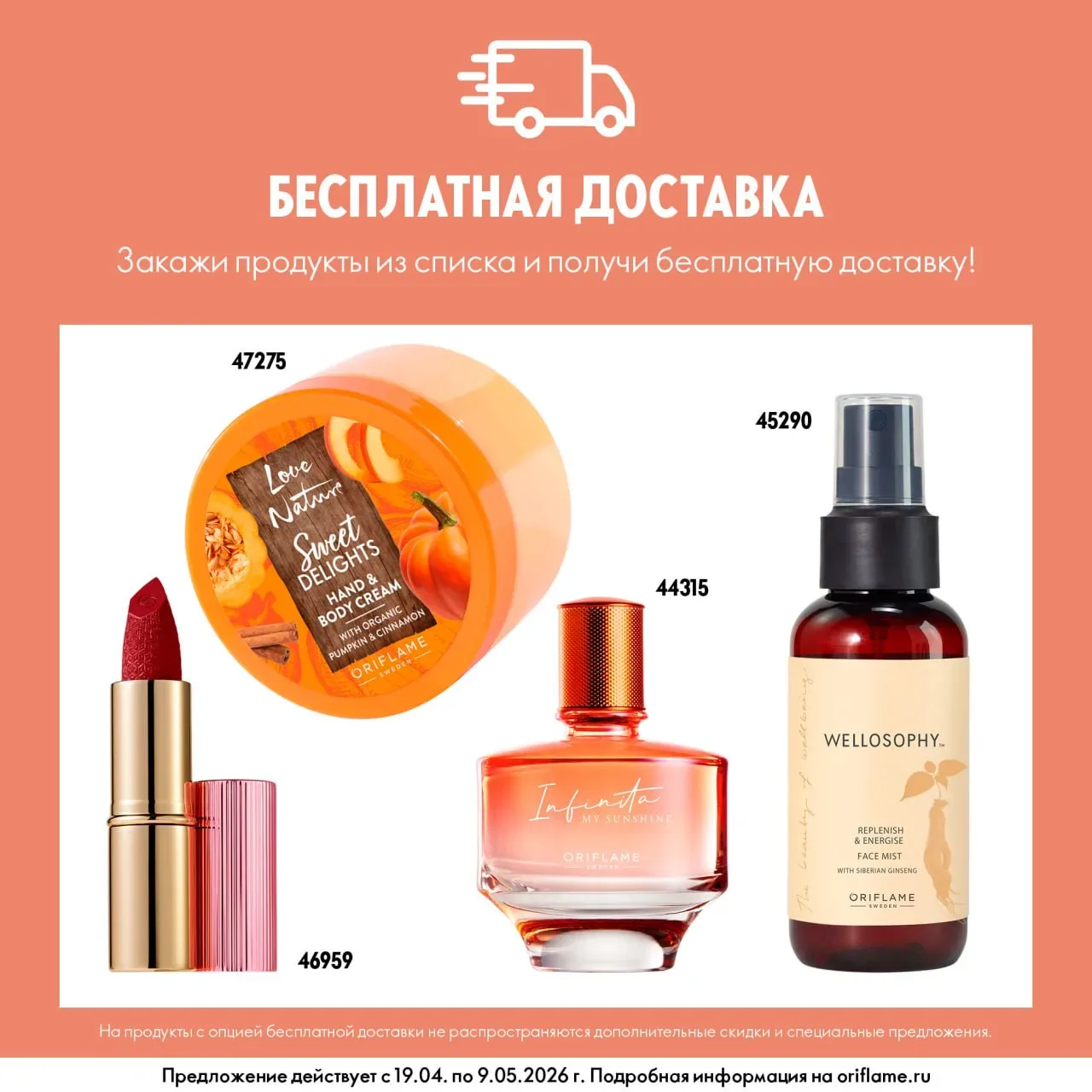 Инвестируйте в красоту и получайте выгоду! С 19 апреля по 9 мая включительно выбрав продукт вместо платы за доставку, вы не только сэкономите, но и порадуете себя и своих близких продуктами Oriflame по специальной цене. ★ Как получить бесплатную доставку? • При размещении заказа перейдите на шаг «Доставка»; • Выберите способ получения заказа; • В появившемся поле нажмите на «Выбрать продукт»; • Добавьте к заказу любой продукт из открывшегося списка; • Плата за доставку обнулится, а выбранный продукт будет добавлен в заказ по специальной цене. ★ Преимущества предложения: • Бесплатная доставка …