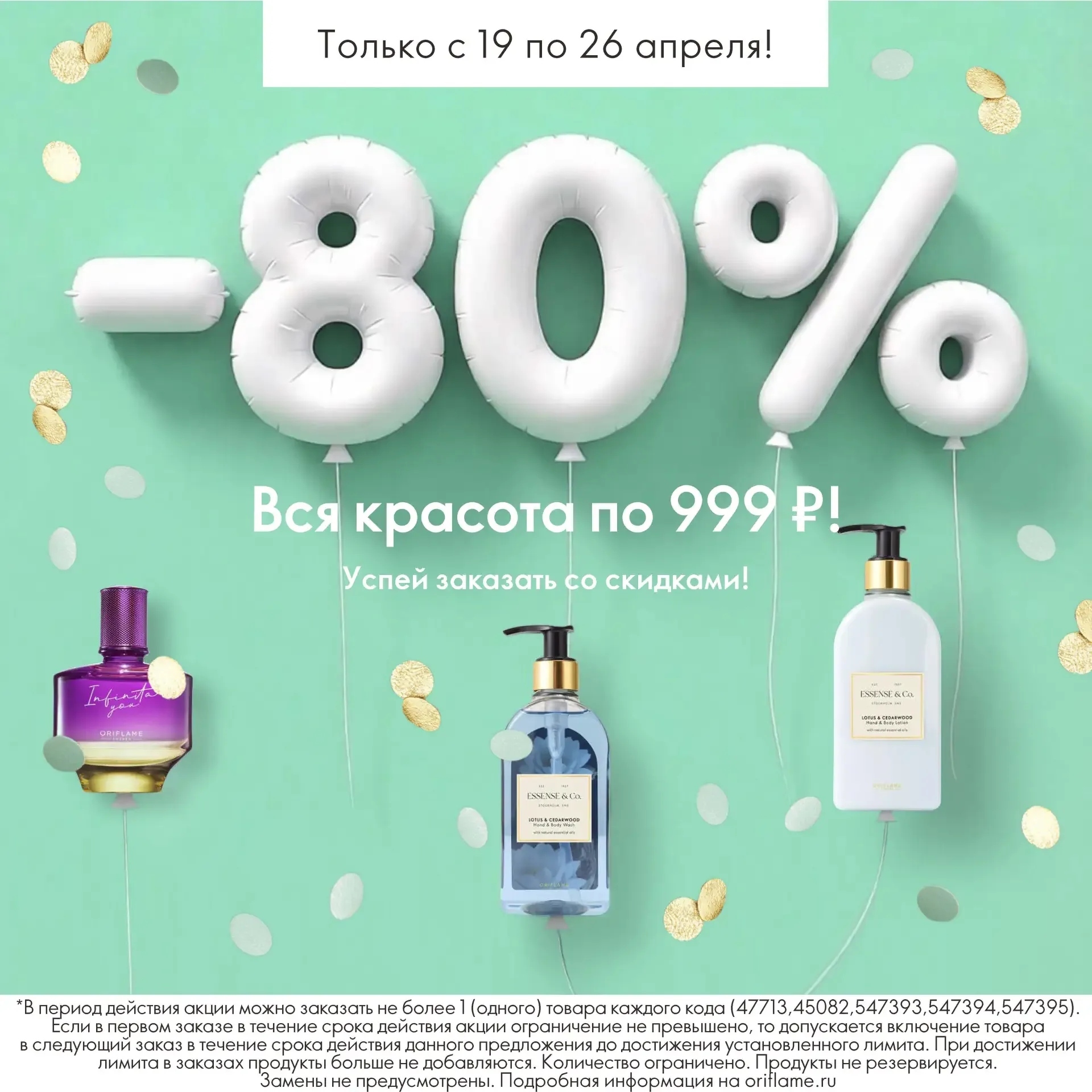 Эксклюзивно онлайн! ★ С 19 по 26 апреля включительно вы можете приобрести вы можете приобрести ароматы, декоративную косметику и средства для ухода со скидкой 80%. Спешите заказать по ссылке https://clck.ru/3T7rch Обратите внимание: • В период действия предложения по специальной цене можно заказать не более одного продукта каждого кода: 47713, 45082, 547393, 547394 и 547395; • Если в первом заказе в течение срока действия предложения ограничение не превышено, то допускается включение продуктов в следующий заказ в течение срока действия предложения до достижения установленного лимита; • Когда …