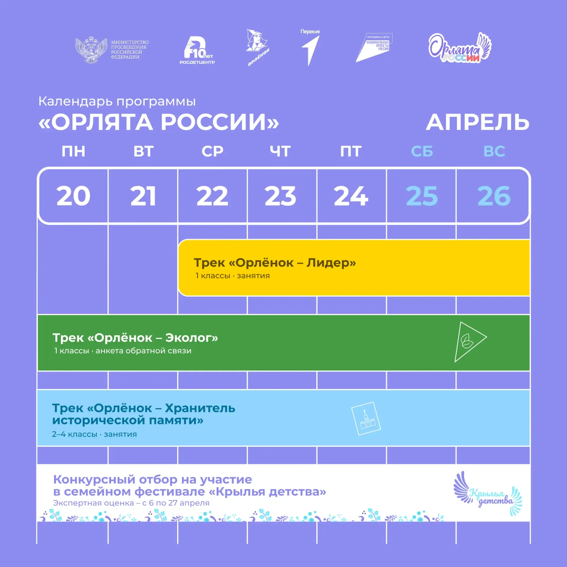 Канал @orlyata_rus посвящен программе «Орлята России», направленной на формирование социально-значимых ценностей у обучающихся: Родина, Команда, Семья, Здоровье, Природа, Познание. Вместе с педагогами ребята проходят 7 треков и получают звание «Орлёнок».