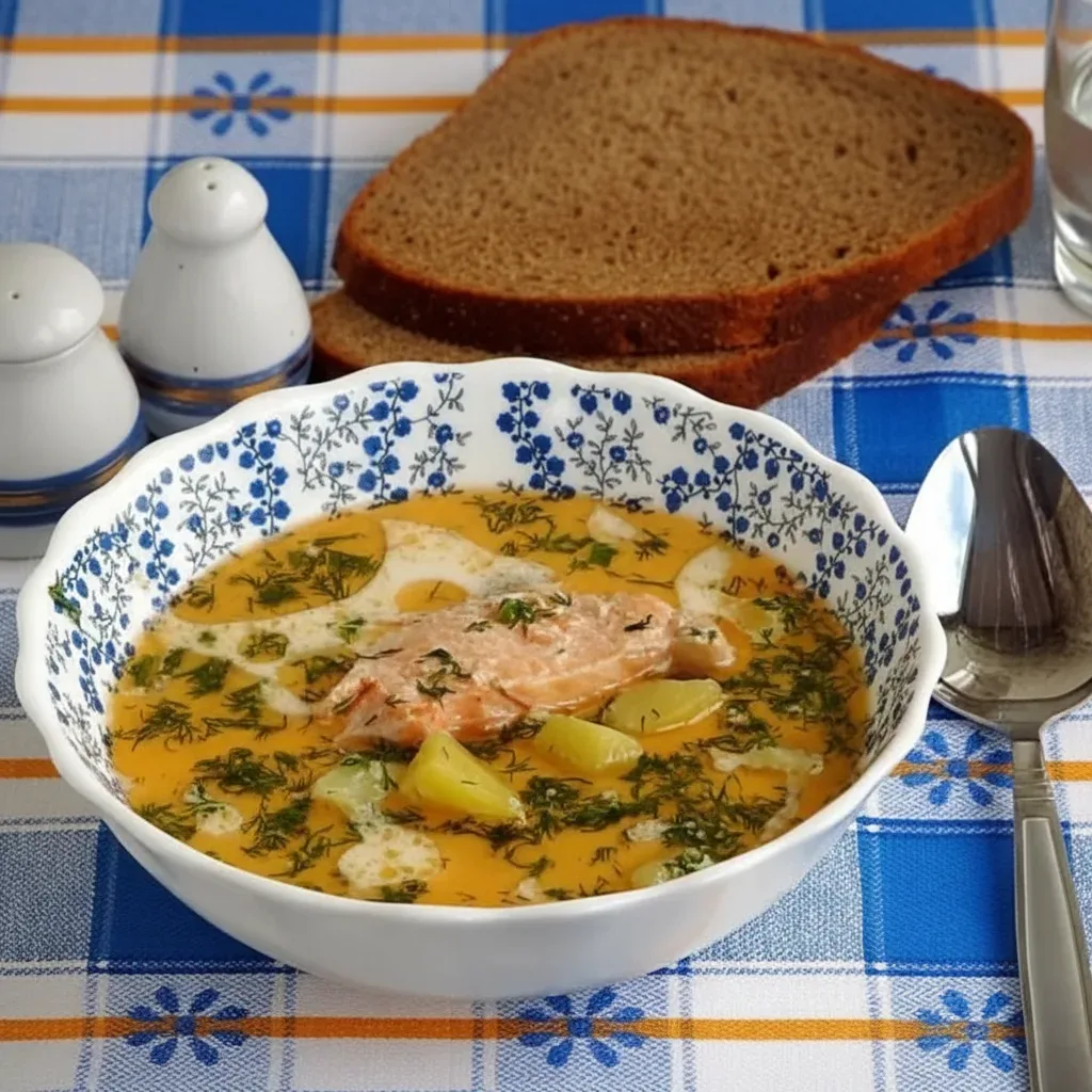 ФИНЛЯНДИЯ Уха по-фински Ингредиенты: - сёмга — 200 г - хребты лосося — 500 г - репчатый лук — 1 шт. - морковь — 1 шт. - сливки 10% — 1 стакан - лавровый лист — 1 шт. - душистый перец — 3 шт. - соль — 1 ч. л. - чёрный молотый перец — 0,5 ч. л. - укроп — 1 пучок - картофель — 3 шт. - вода — 2 л. Пошаговый рецепт: 1. Сварите бульон. Залейте хребты лосося и сёмгу 2 литрами воды. Добавьте лавровый лист и душистый перец. Доведите до кипения, снимите пену. Варите 30 минут на медленном огне, затем процедите. 2. Подготовьте овощи. Нарежьте картофель кубиками, лук — мелкими кусочками, морковь — соломко…