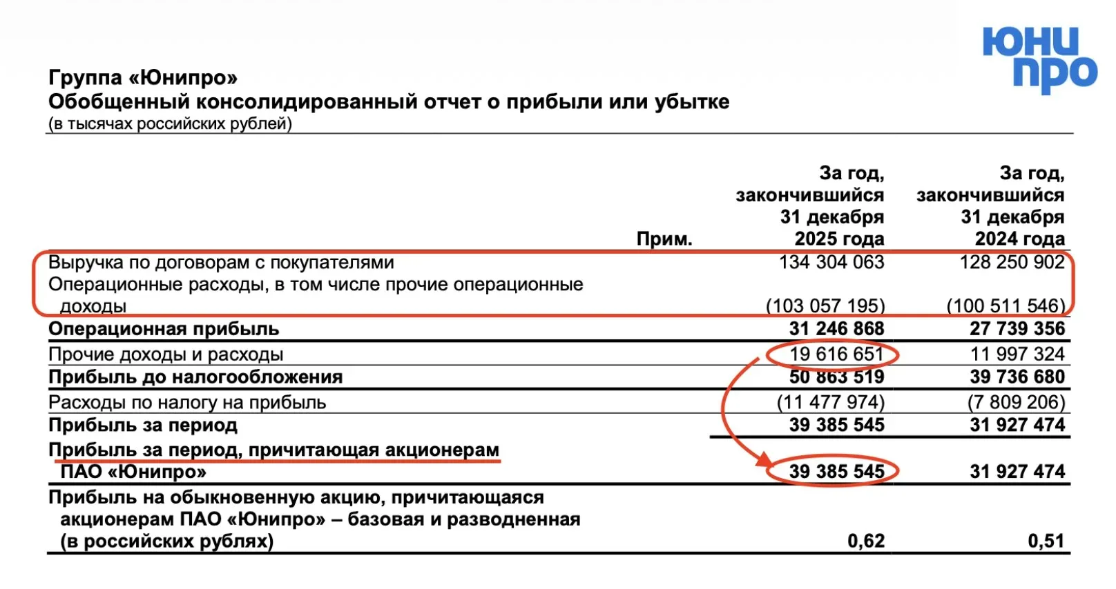 Юнипро - денежная бомба Одним из самых стойких секторов на российском рынке в последние годы является электроэнергетический. Растущие тарифы и высокий уровень кэша на счетах позволяют компаниям генерировать дополнительный доход. Сегодня разбираемся с компанией Юнипро и ее отчетом за полный 2025 год. 🔌 Итак, выручка компании за отчетный период выросла на 4,7% до 134,3 млрд рублей. Такая скромная динамика обусловлена снижением доходов от продажи мощности из-за окончания договора о предоставлении мощности на энергоблоке №3 Березовской ГРЭС. Не помог и рост тарифов до максимальных значений в сере…