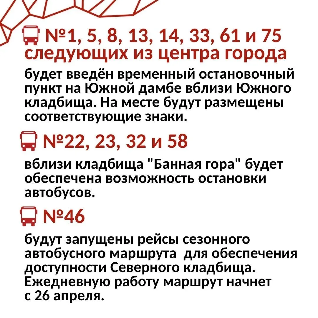 🚌 Полезная информация от пермского департамента транспорта. Завтра, в Радоницу, около городских кладбищ будут организованы временные остановки общественного транспорта. А уже с 26 апреля стартует работа сезонного автобуса №46, который будет регулярно курсировать до Северного кладбища.