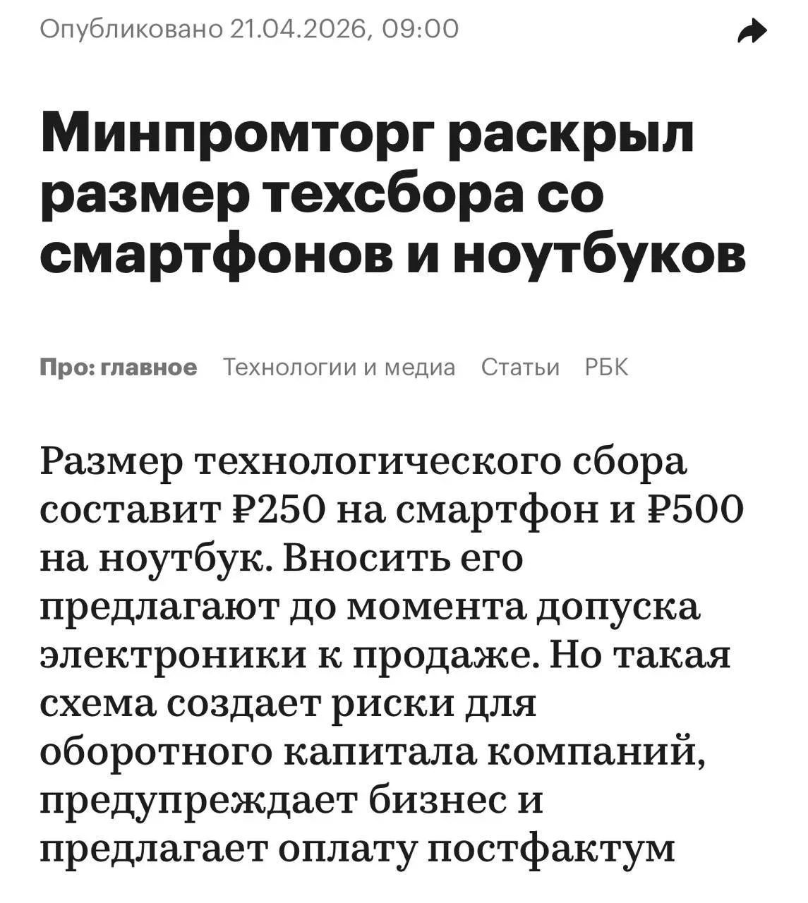 🔴 Цены на ВСЕ смартфоны и ноутбуки улетят вверх уже в сентябре: в России начнут взимать технологический сбор на электронику — за каждый проданный ноутбук россиянам придётся отдавать 500 рублей, за смартфон — 250 рублей, пишет РБК. В Минпромторге заявили, что сбор вводится для поддержки отечественной электронной и радиоэлектронной промышленности, а в дальнейшем механизм хотят распространить и на другие категории техники. Бизнес уже переживает не из-за суммы, а из-за условий: платить сбор придётся заранее — ещё до того, как техника попадёт в магазины. А это уже бьёт по оборотному капиталу и мож…