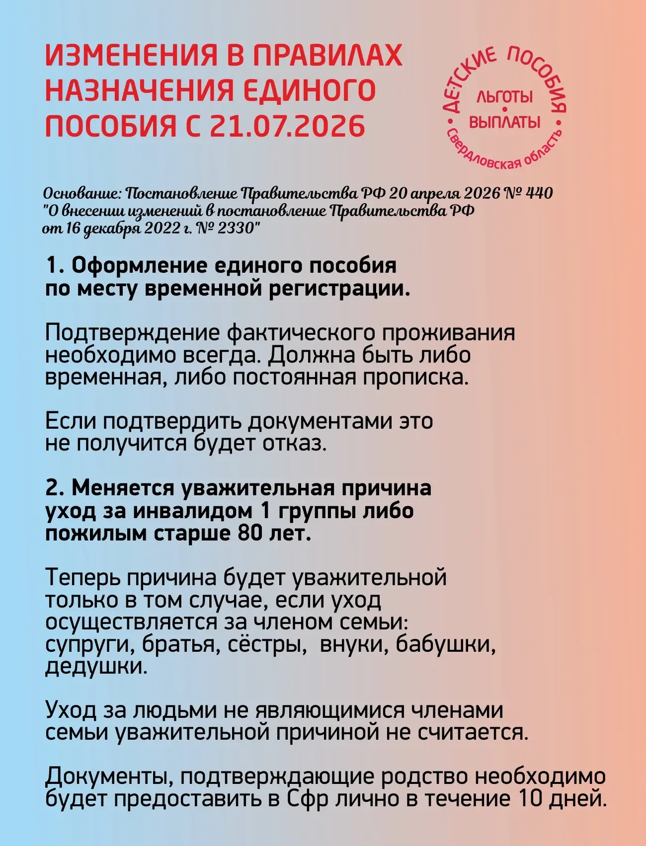 Канал будет полезен жителям Свердловской области, которые хотят быть в курсе всех доступных социальных выплат и льгот. Особенно актуален для семей с детьми, пенсионеров, малоимущих граждан и всех, кто нуждается в материальной поддержке от государства. Благодаря каналу @posobiya_nt вы сможете своевременно узнавать о новых пособиях и не пропустить сроки подачи заявлений.