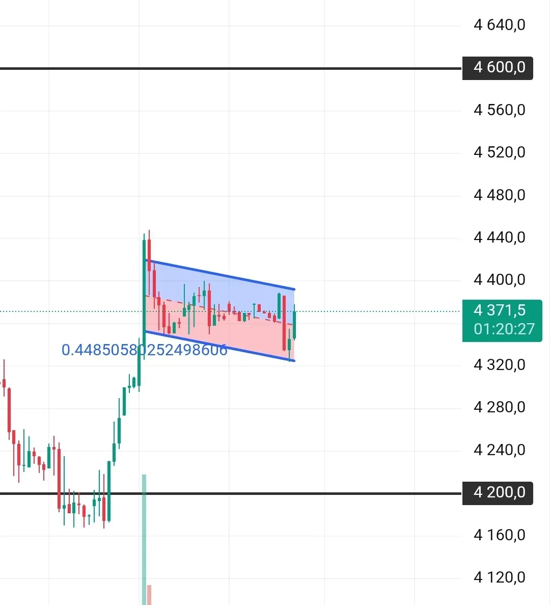 #OZON Сразу к идее! На двухчасовом графике Озон рисует флаг. Классическая фигура продолжения тренда. Что вижу. Цена сформировала горизонтальную поддержку на 4320. И нисходящую верхнюю границу от 4600 к 4400. Сужаемся. Осциллятор нейтральный. Ни перекупленности, ни перепроданности. Внутри флага входить не люблю — можно болтаться несколько дней. ☝️План: · Жду пробоя верхней границы флага (4400) · Вход на пробое с подтверждением объёмом · Цель - 4600 (высота флага + пробой) · Стоп - 4320 (нижняя граница флага) Если пробьют вниз — фигура отменится. Но пока склоняюсь к верхнему пробою. Не иир