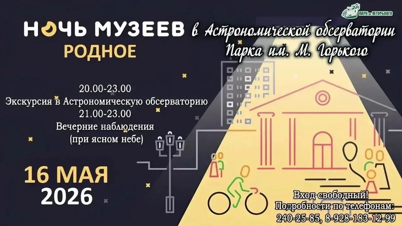 Ночь музеев в Астрономической обсерватории парка им. М. Горького ⏰16 мая (сб), с 20:00 до 23:00 📍Парк им. А.М. Горького 💵Вход свободный Программа включает в себя: 🔹рассказ о многолетней истории первой в Ростове-на-Дону научно-просветительской обсерватории; 🔹посещение всех помещений исторического здания, наблюдательной башни; 🔹знакомство с телескопами, а также просмотр документального фильма астрономической тематики. С 21:00 до 23:00 при ясном безоблачном небе все желающие смогут заглянуть в окуляр телескопа. Подробности по телефонам - 88632402585; 89281831299 Афиша TG • Афиша MAX