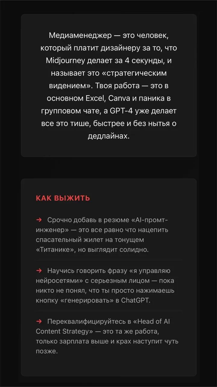 Друзья, судя по данным, меня уже заменяет ИИ. Пишет быстрее, не переживает и, главное, не задаёт лишних вопросов. Но есть ощущение, что это всё красиво звучит только до первого реального запроса. Потому что, пока ИИ генерирует, люди всё ещё думают, выбирают и понимают, что именно нужно, чтобы доходить до реальных результатов — в цифрах, сборах и долях 😉