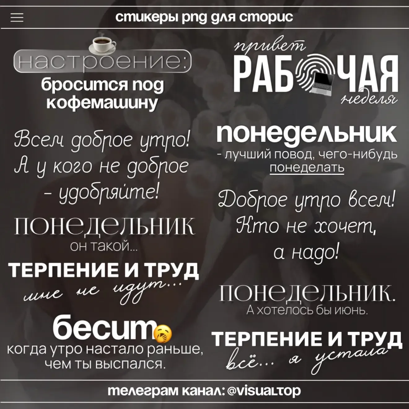 Канал @visualtop предлагает коллекцию авторских стикеров в формате PNG, предназначенных для оформления сторис. Основная цель контента — помочь блогерам, экспертам и активным пользователям соцсетей увеличить вовлеченность своей аудитории через визуально привлекательные и полезные материалы.