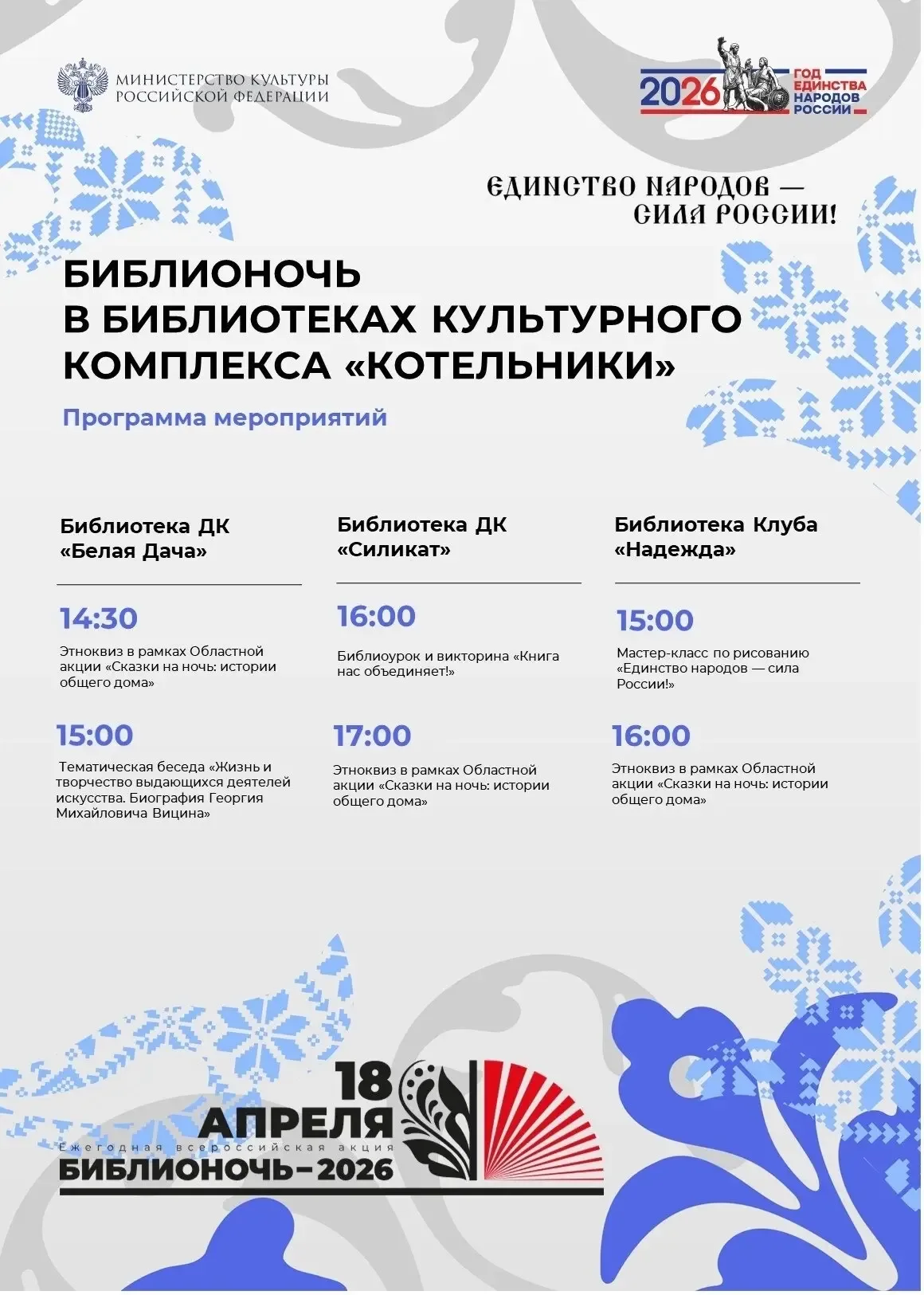 Люберцы | Малаховка | Томилино | Жуковский | Москва🏡 📖 Библионочь-2026 в Котельниках Этой весной Россия в 15-й раз отметит «Библионочь». В этом году акция проходит под девизом – «Единство народов – сила России!». Библиотеки в Котельниках подготовили для вас особенную программу: от этноквизов до творческих встреч. Выбирайте локацию и приходите всей семьей! 📍Библиотека ДК «Белая Дача» 🔸14:30 – Этноквиз «Сказки на ночь: истории общего дома». 🔸15:00 – Тематическая беседа о жизни и таланте легендарного Георгия Вицина. 📍Библиотека ДК «Силикат» 🔸16:00 – Библиоурок и викторина «Книга нас объединяет!»…