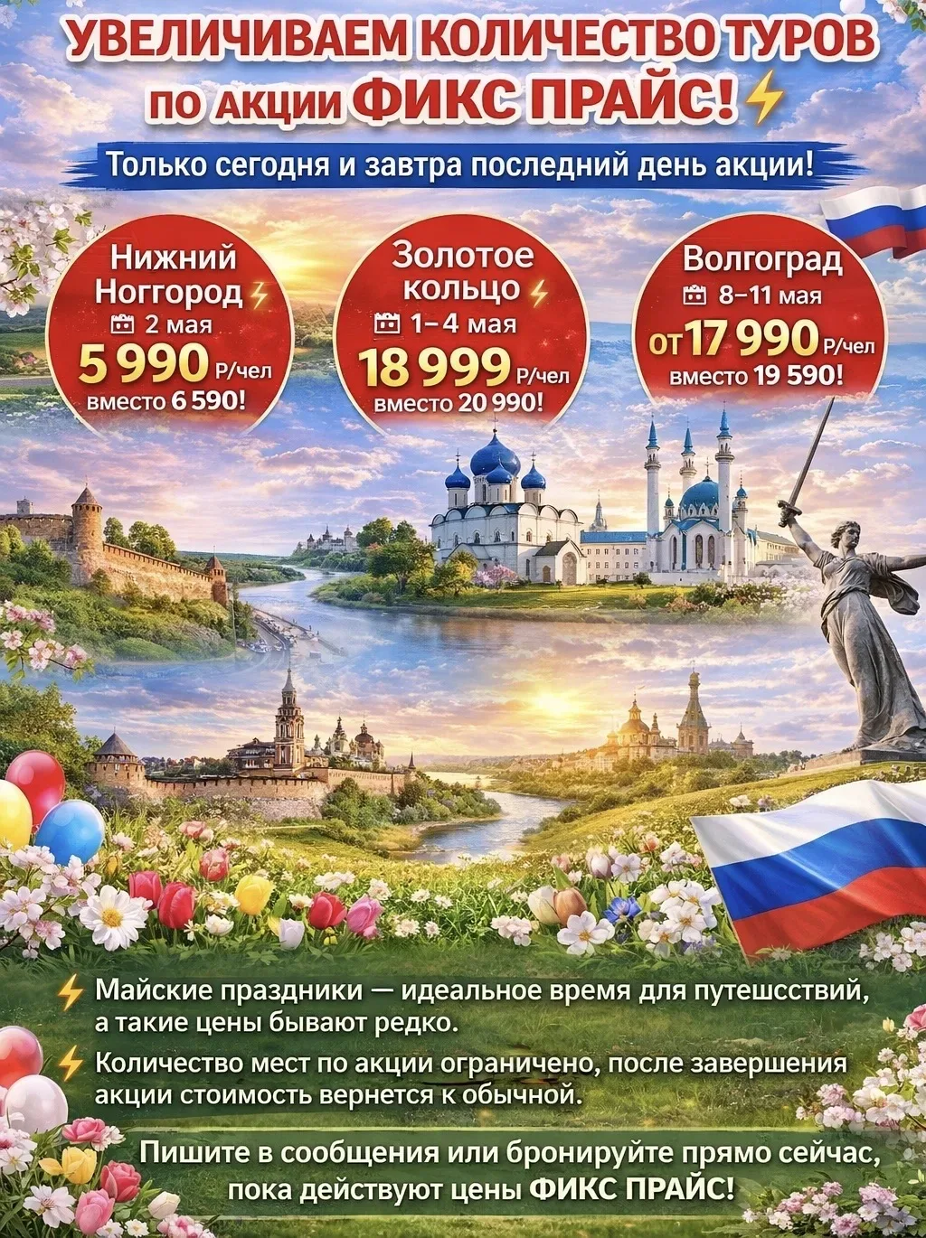 🔥 УВЕЛИЧИВАЕМ КОЛИЧЕСТВО ТУРОВ ПО АКЦИИ ФИКС ПРАЙС! 🔥 По вашим просьбам добавили ещё больше туров по специальным ценам! действует только СЕГОДНЯ и ЗАВТРА Успейте забронировать майские по фиксированной цене👇 ✨ Нижний Новгород 1 день 📆 2 мая (выезд вечером 1 мая) 💰 5 990 ₽/чел вместо 6 590 ₽ ✨ Золотое кольцо 📆 1–4 мая 💰 18 999 ₽/чел вместо 20 990 ₽ ✨ Волгоград 📆 8–11 мая 💰 от 17 990 ₽/чел вместо 19 590 ₽ Майские праздники — идеальное время для путешествий ⚡Количество мест по акции ограничено, возвращаем цены прошлого года!!! Бронируем туры с Туроператорам Волна- Тревел! Ведущий туроператор Улья…