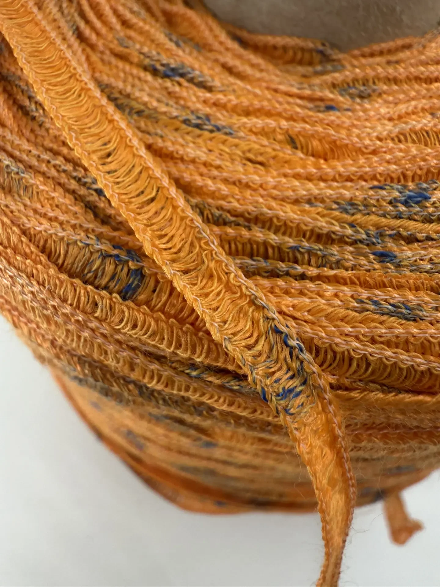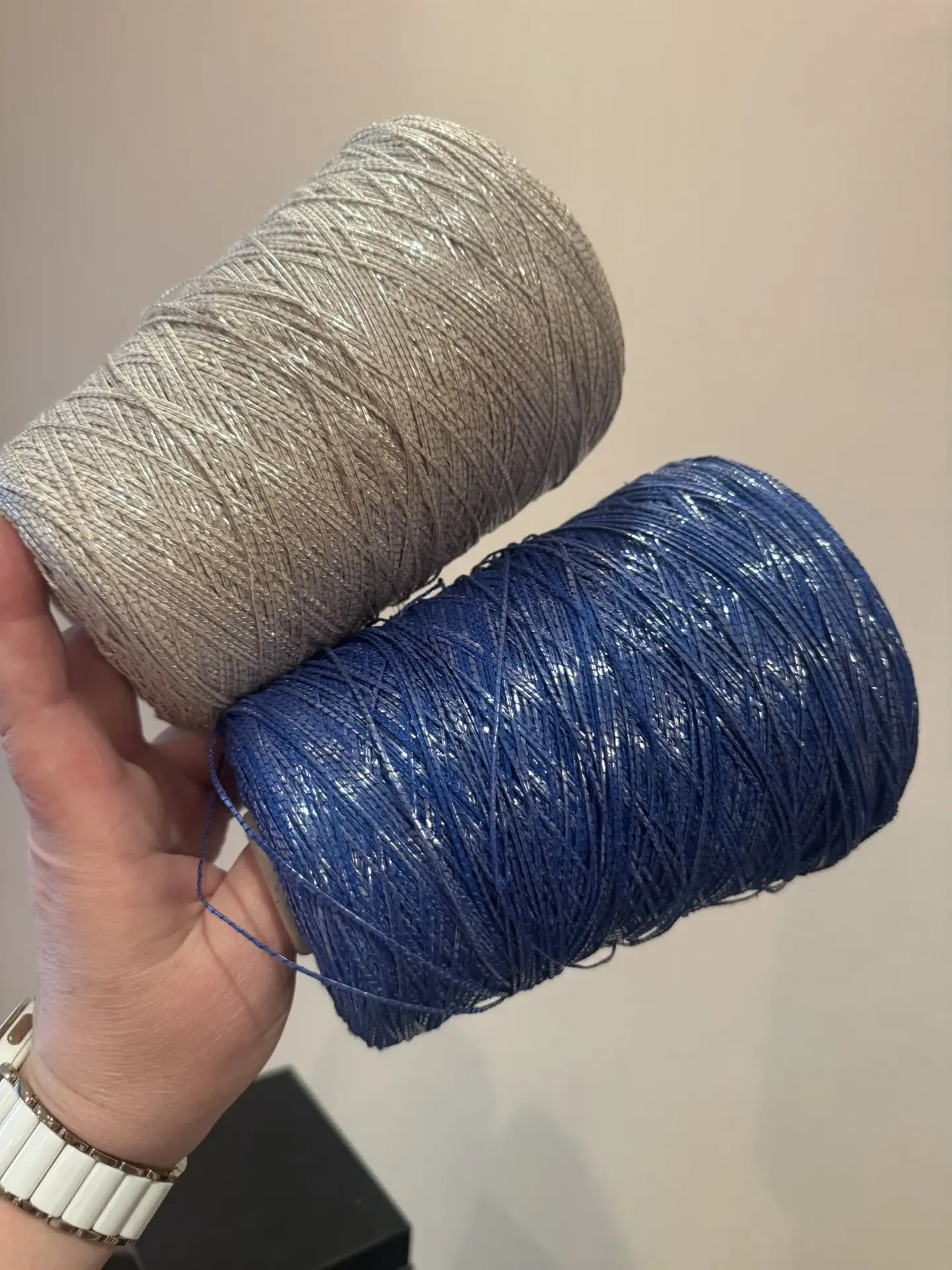 И наш паровозик из трех артикулов, как всегда по 1 бобинке на цвет. Первый артикул FILM - ниточки хлопка с прозрачной фольгой-слюдой, либо если исходить из названия артикула - то кинолентой) Второй артикул MATRIX. Здесь хлопковая вспушенная ровница в очень тонкой полиамидный сеточке. Тактильно мягкий и приятный