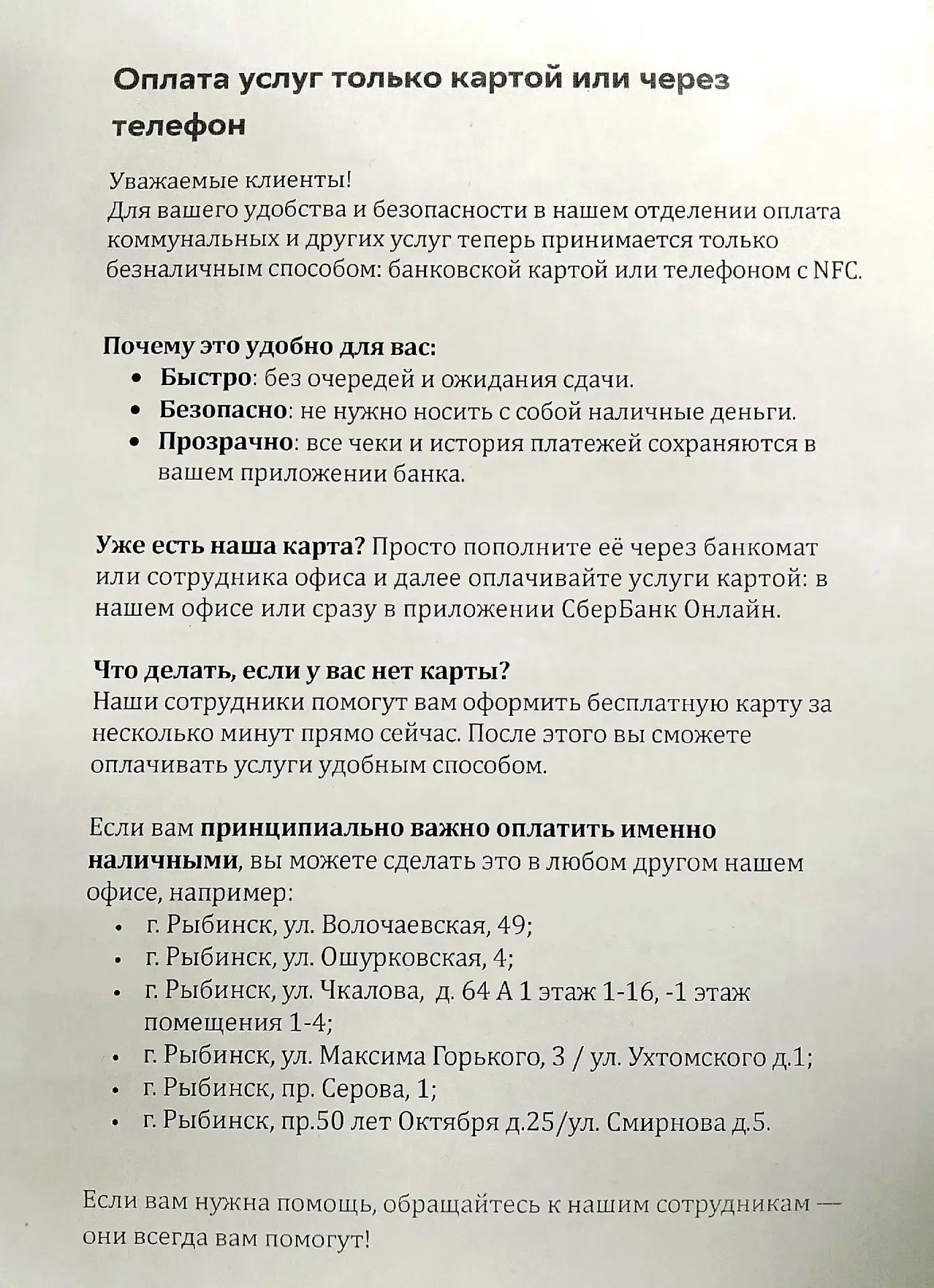 Ярославский Сбербанк объяснил отказ в приеме наличных в отделениях Рыбинска Как выяснилось, это пилотный проект Ранее в соцсетях жители Рыбинска пожаловались, что в отделениях Сбербанка при оплате услуг ЖКХ у них отказываются принимать наличные деньги. В частности, 10 апреля женщина пришла оплатить квитанции ЖКХ в отделение Сбербанка на улице Гоголя, как делала это всегда, но столкнулась с отказом. В терминале выдачи талонов исчез пункт «оплата наличными» — остались только «оплата банковской картой» и «оплата со счета». По ее словам, ответ начальницы отделения был категоричным: «Мы теперь нал…